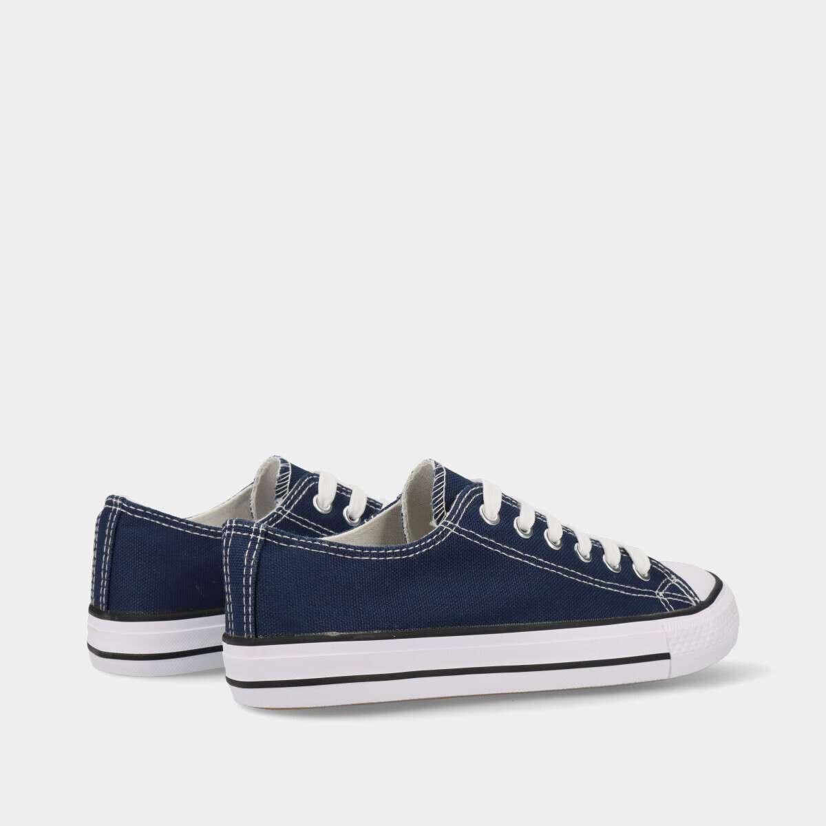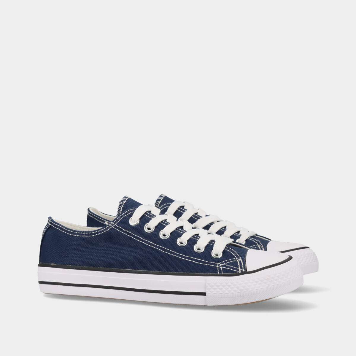 Ténis unissexo em lona azul com cordões brancos e sola de borracha branca com risca preta.