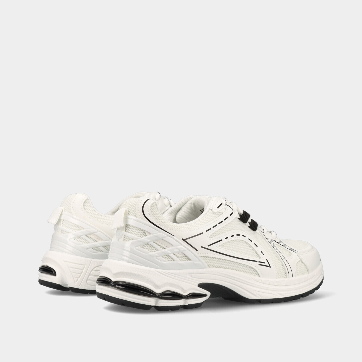 Ténis desportivos para homem e mulher em branco e preto com atacadores, malha respirável e palmilha removível, ideais para desporto, ginásio, caminhadas ou uso casual.