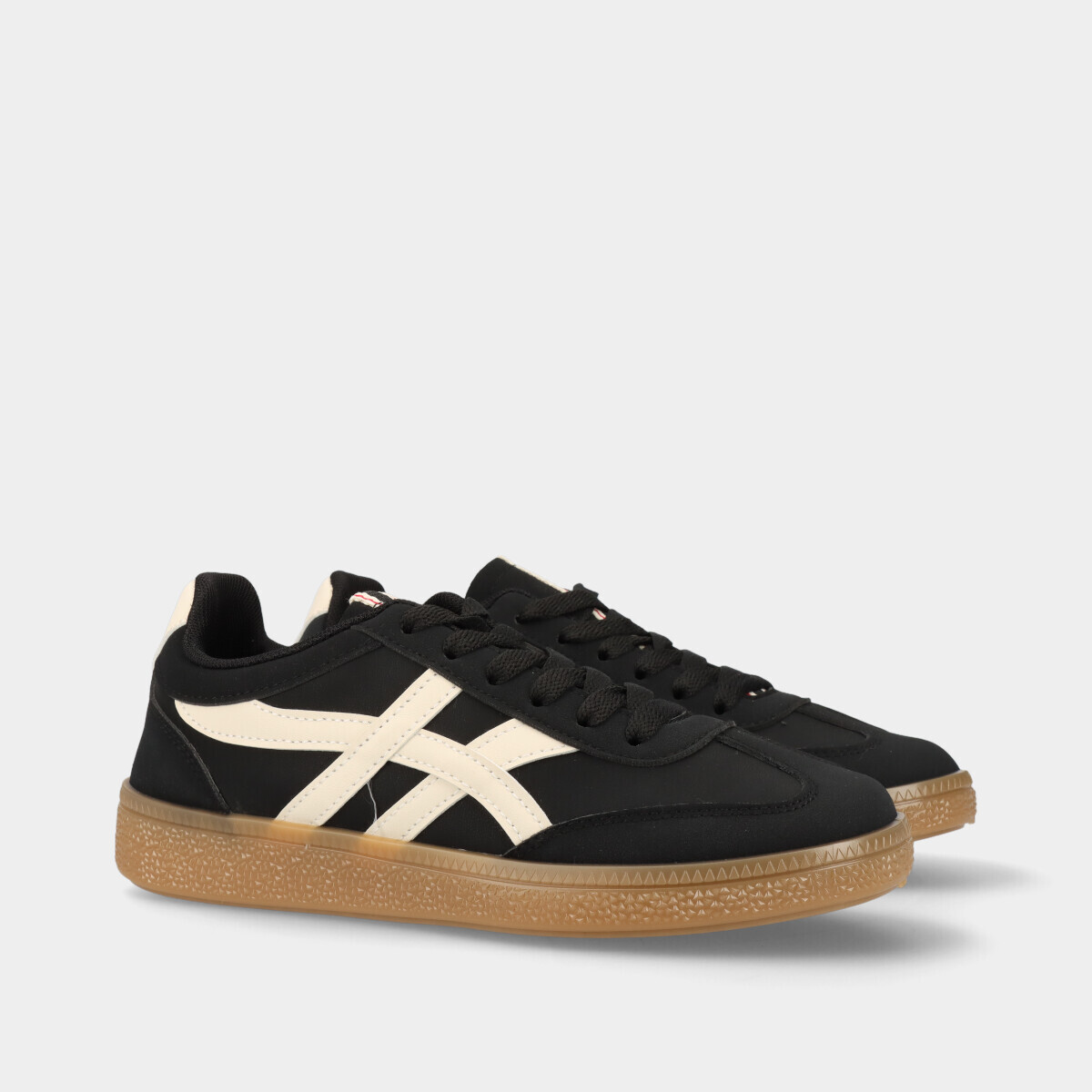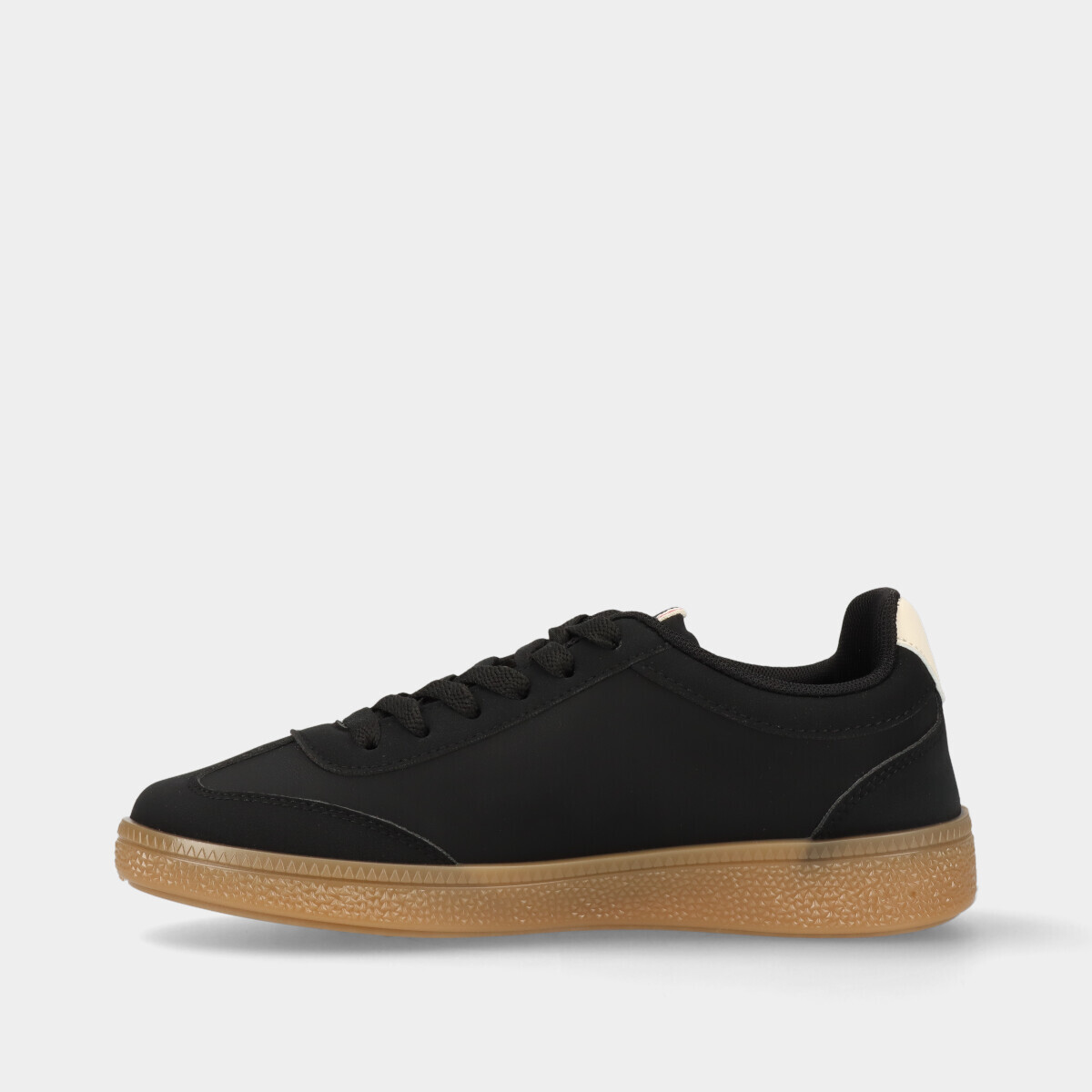 Tênis casuais unissexo na cor preta com detalhe branco e sola em borracha castanha. Conforto e estilo para o dia a dia.
