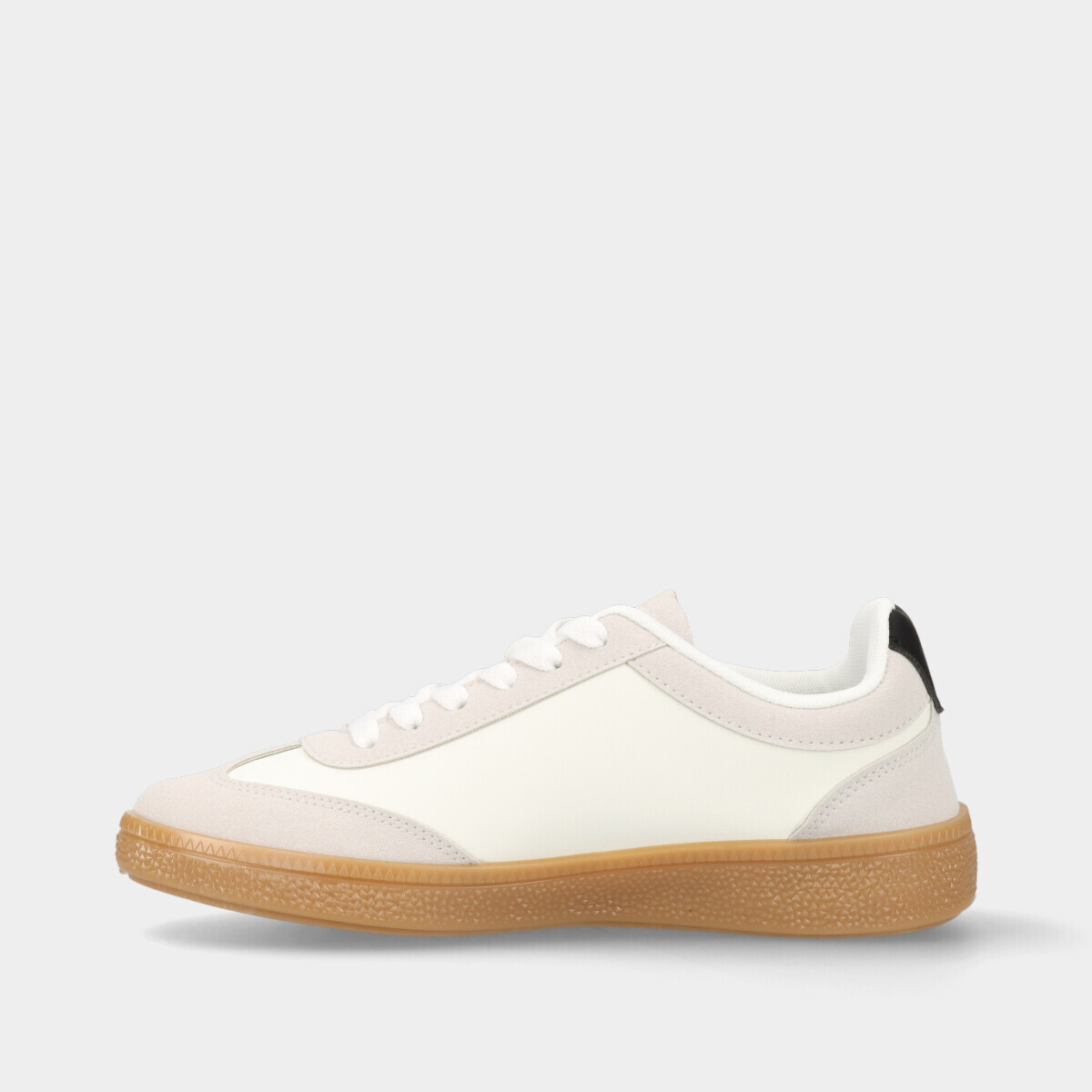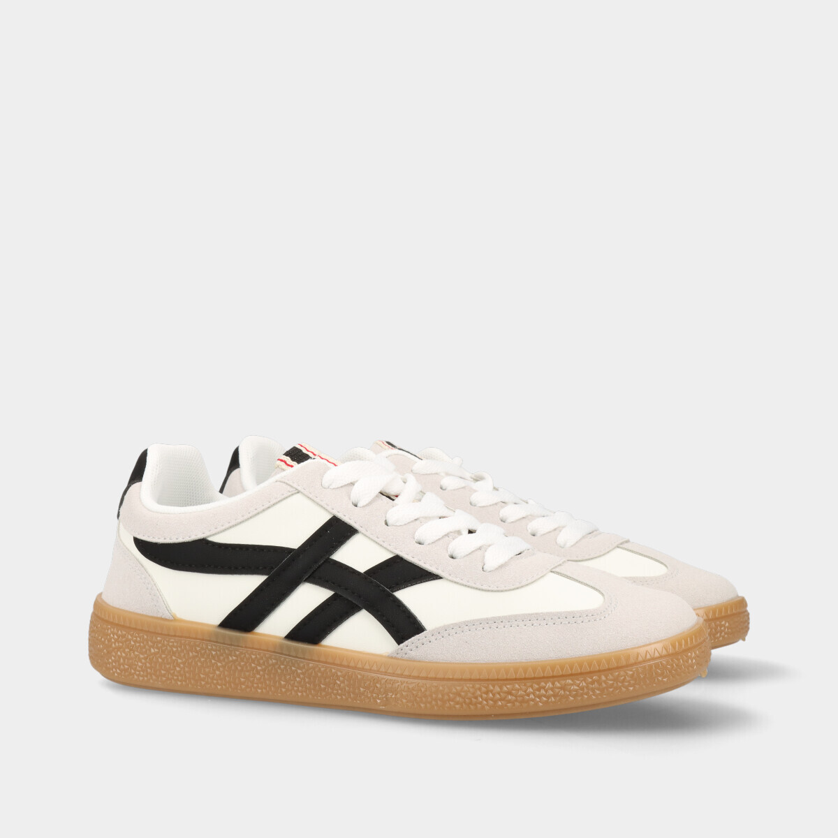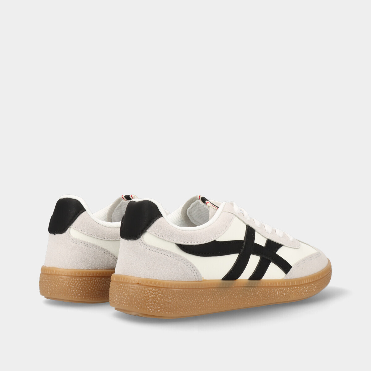 Tênis casuais unissexo em branco e cinza com detalhe preto e sola em borracha castanha. Conforto e estilo para o dia a dia.