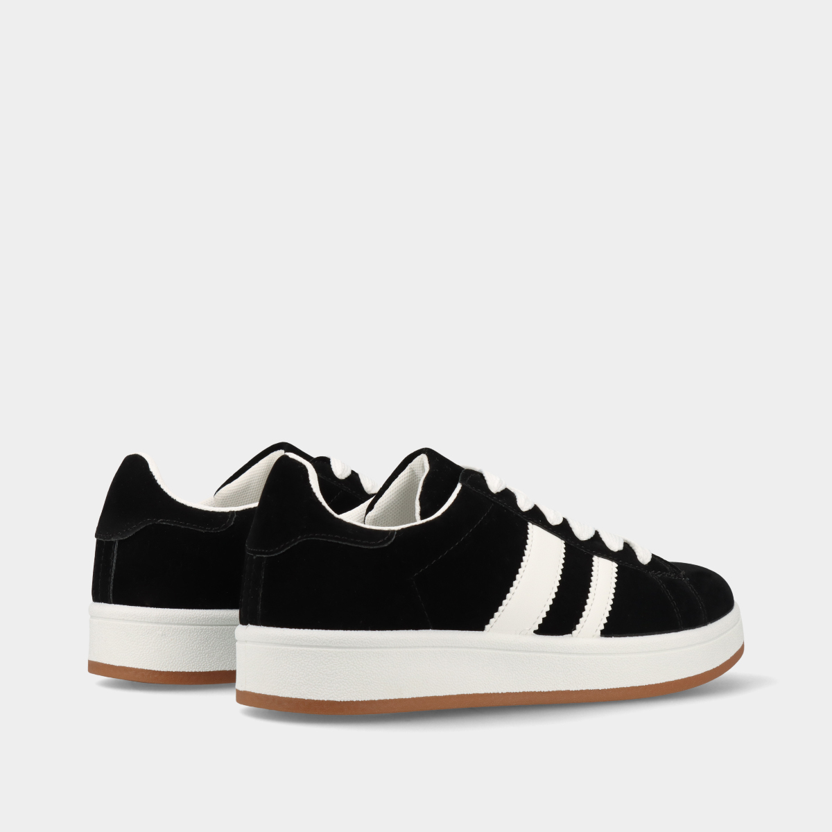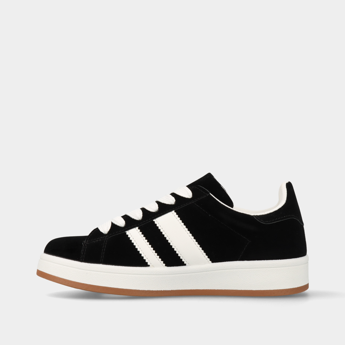 Ténis unissexo em preto com textura estilo veludo, detalhes em branco, atacadores largos e palmilha removível, ideais para uso diário e para um look moderno e versátil.