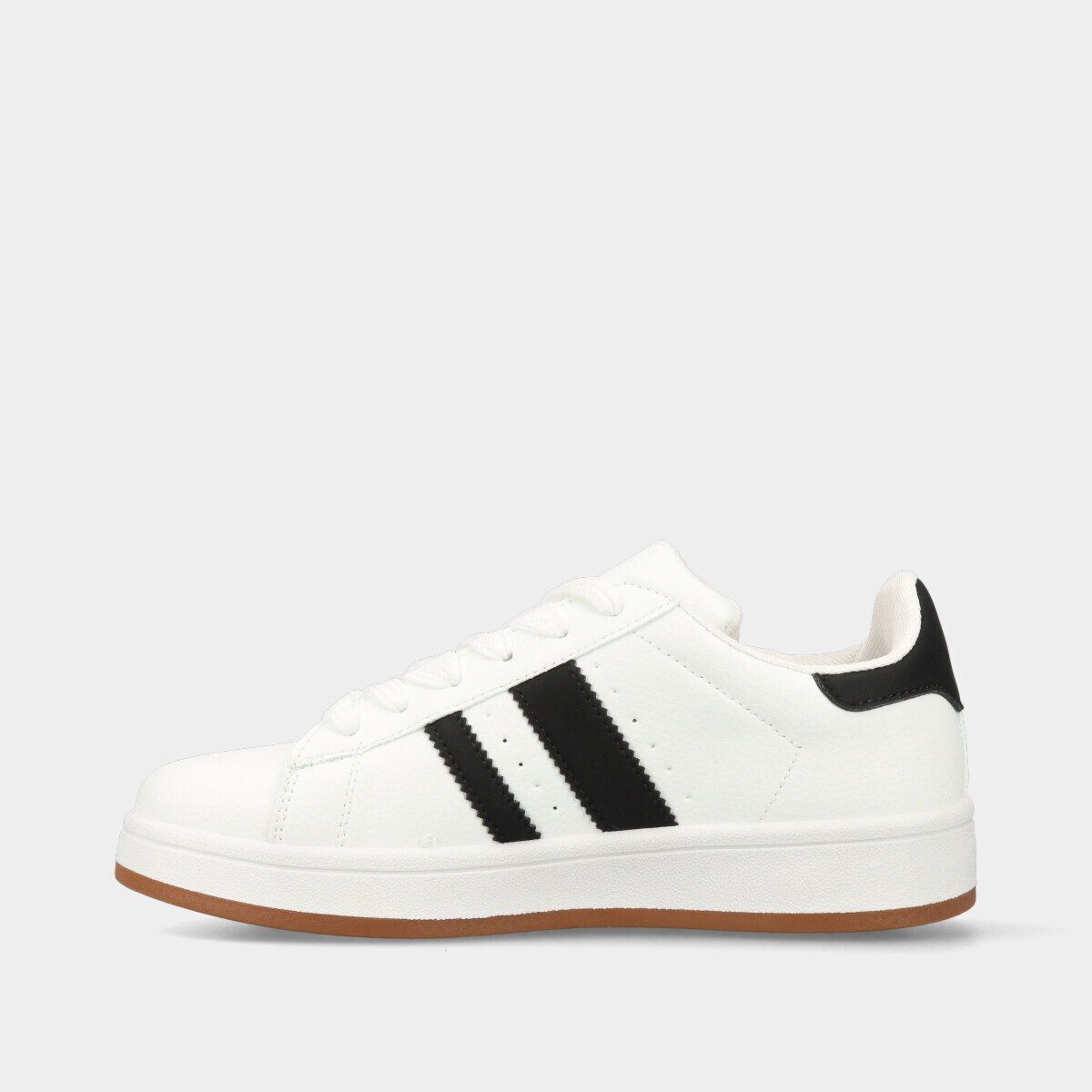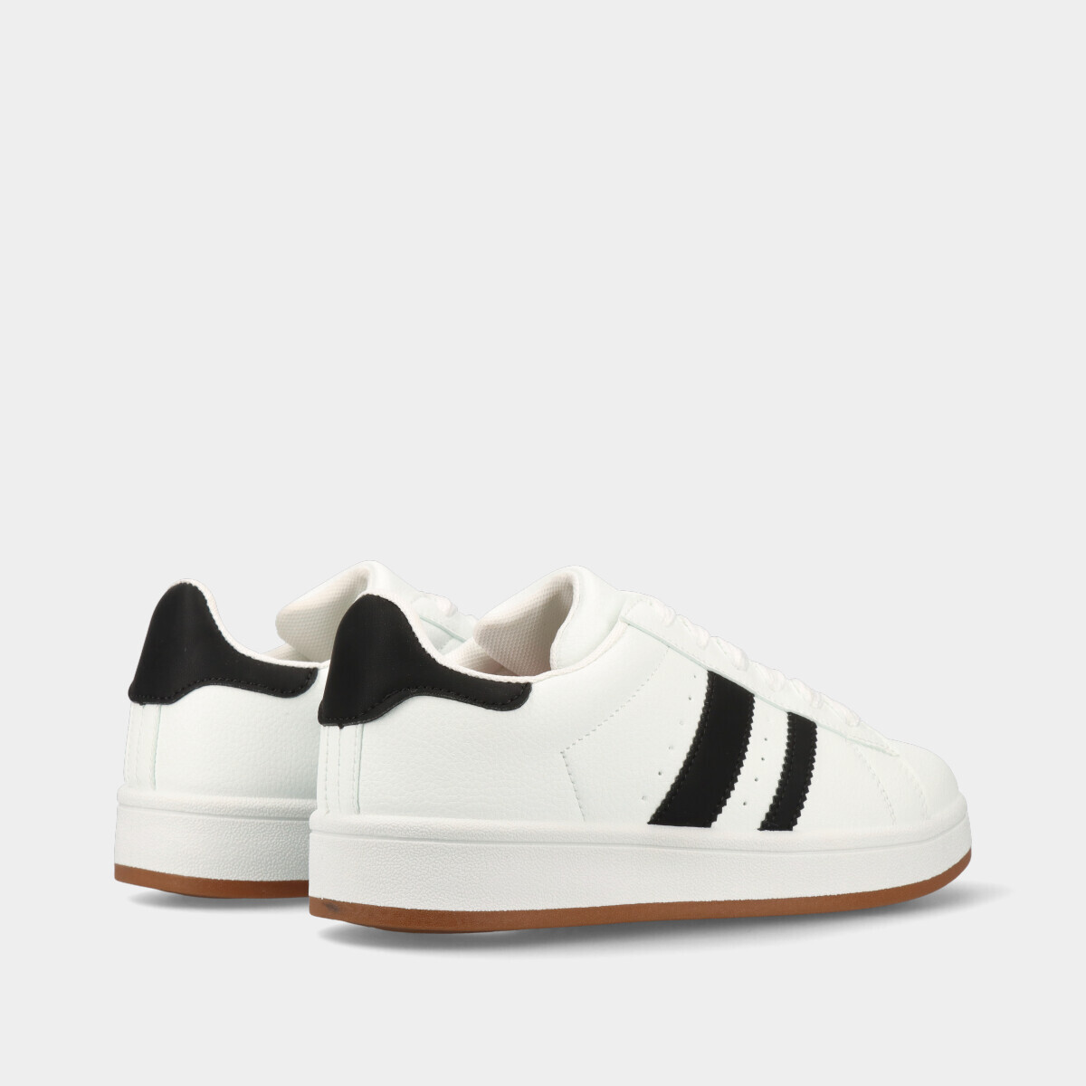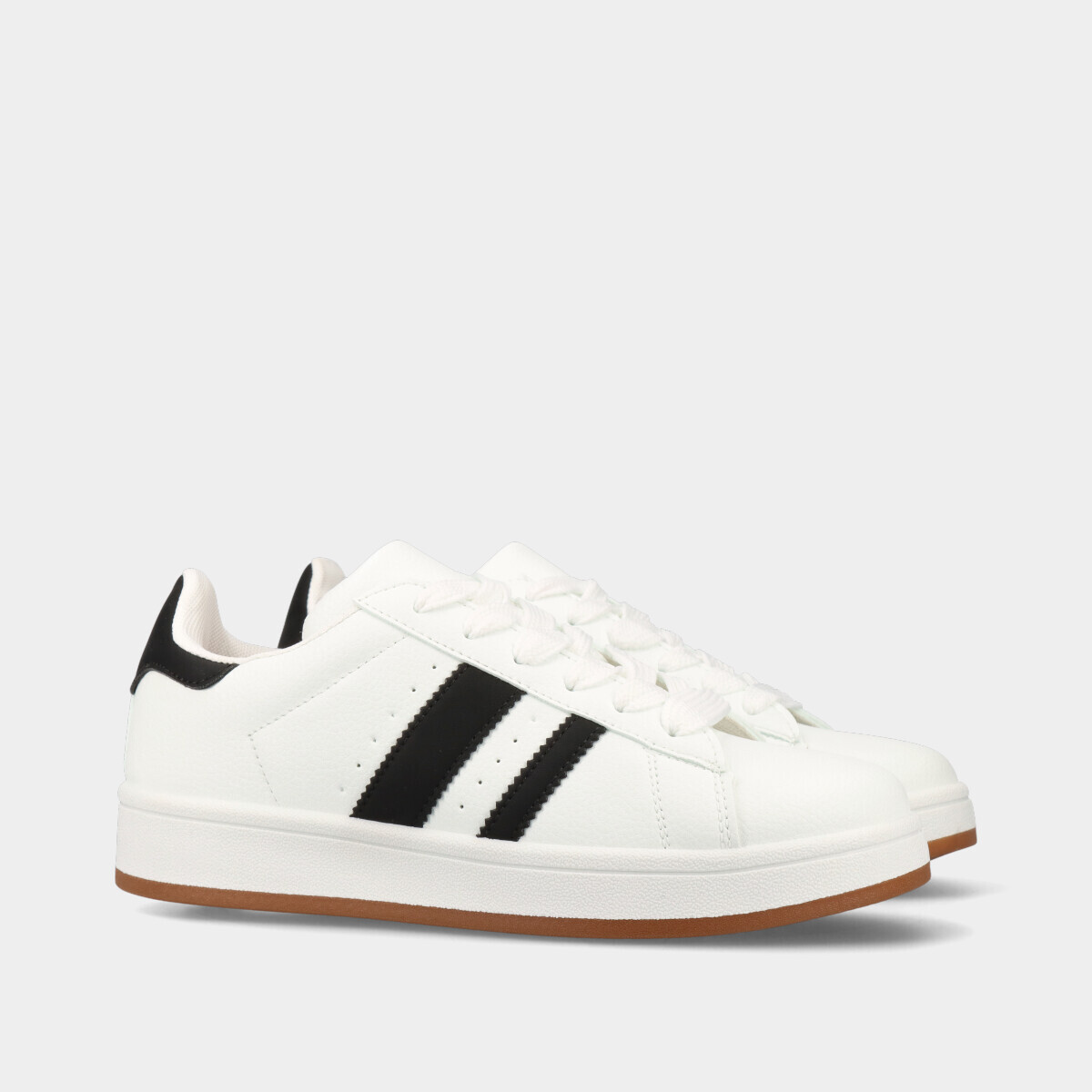 Ténis unissexo em branco, com detalhes em preto, atacadores largos e palmilha removível, ideais para uso diário e para um look moderno e versátil.