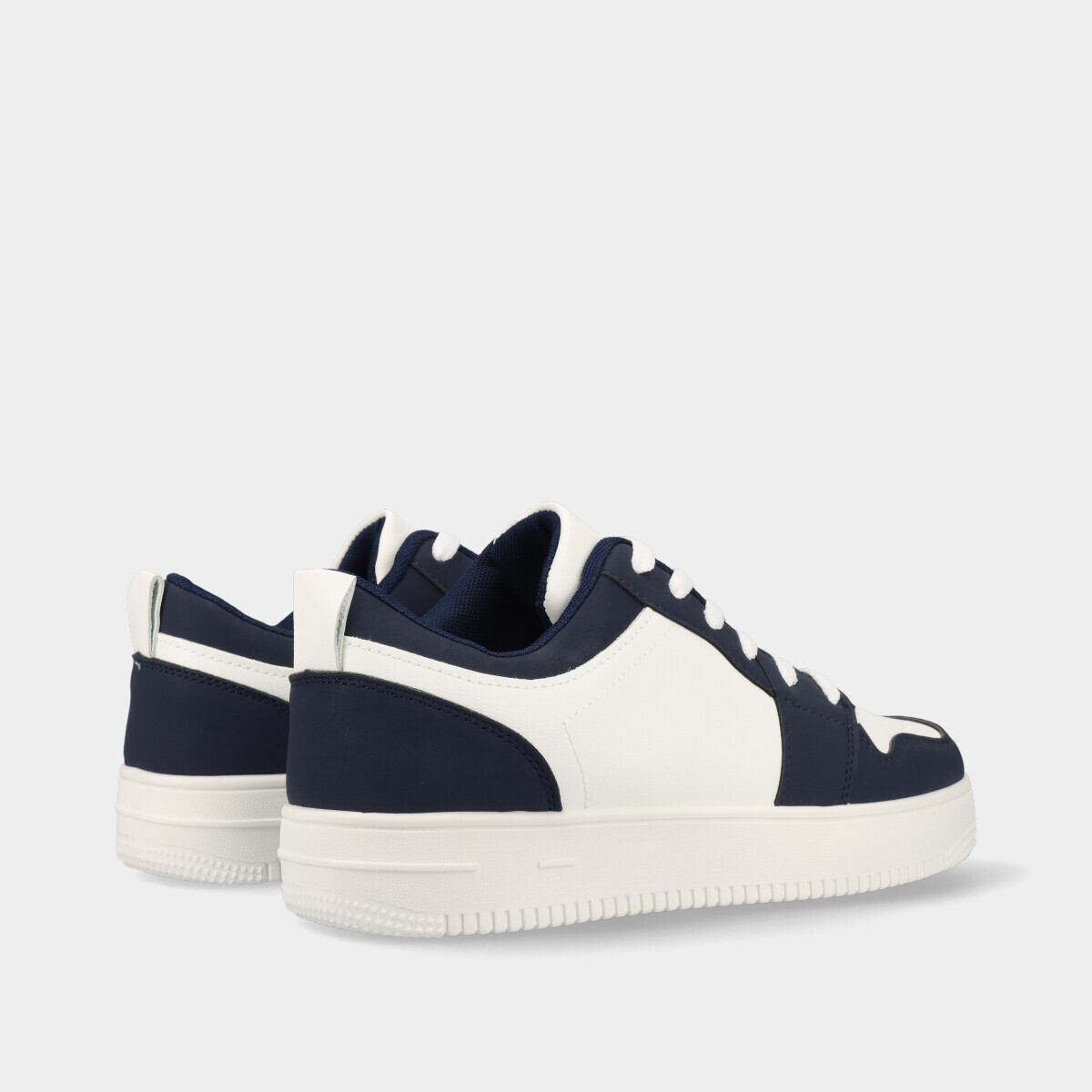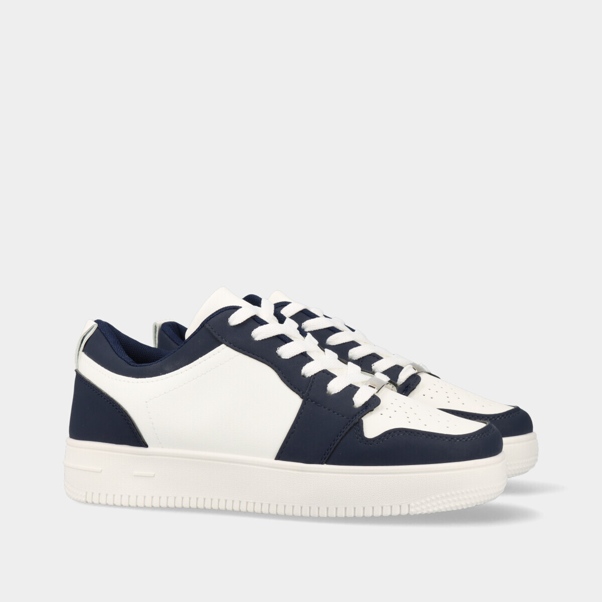Ténis casuais unissexo em branco e azul com atacadores, forro e palmilha confortáveis para uso diário.