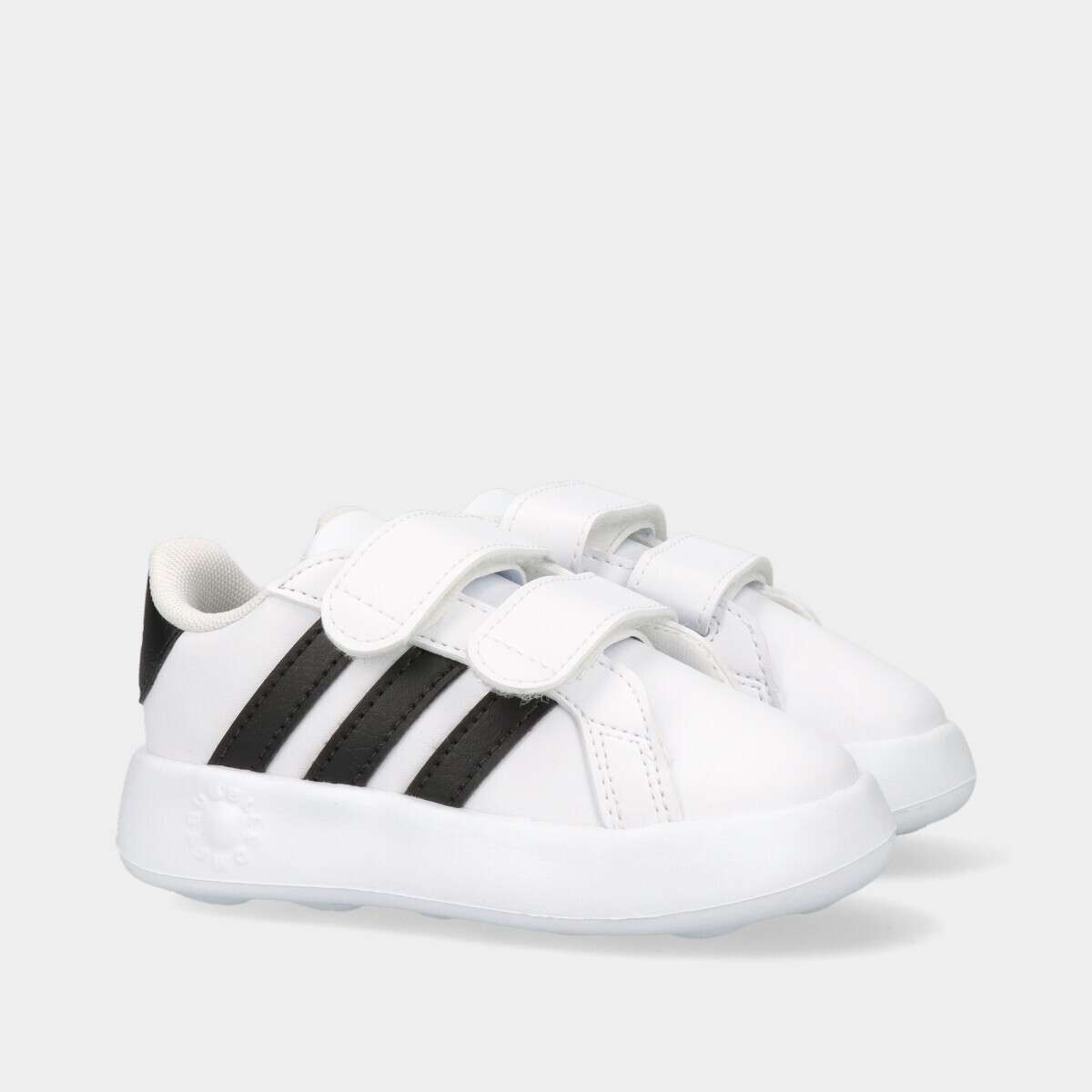 Tênis na cor branca com pormenores em preto, fecho de velcros e sola às bolinhas em EVA.