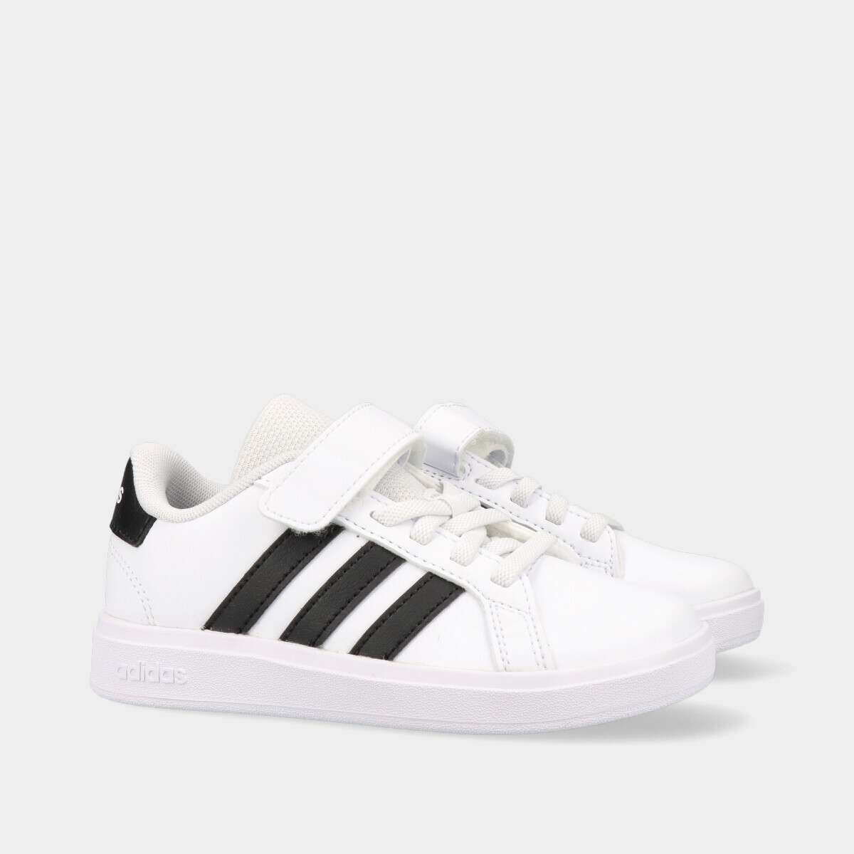 Tênis na cor branca com pormenores em preto, velcro e cordão elástico.