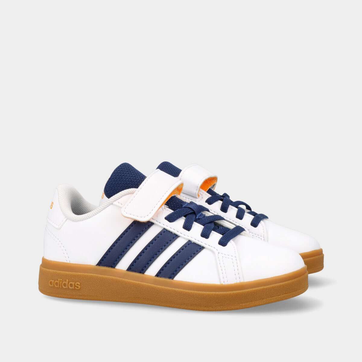 Tênis na cor branca com pormenores em azul, velcro e cordão elástico.