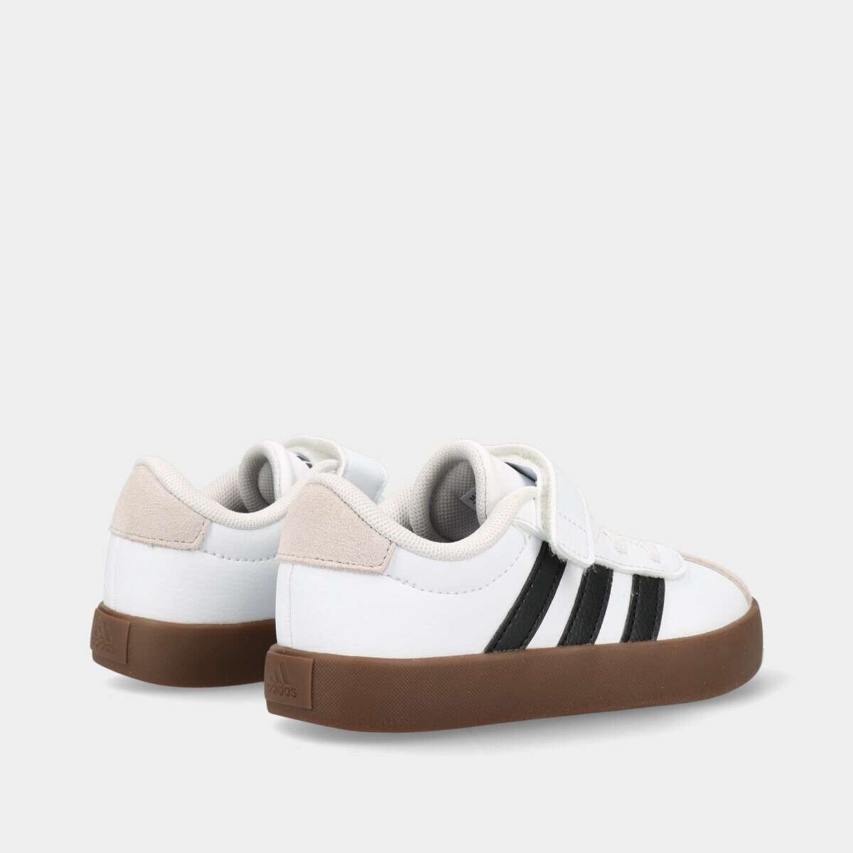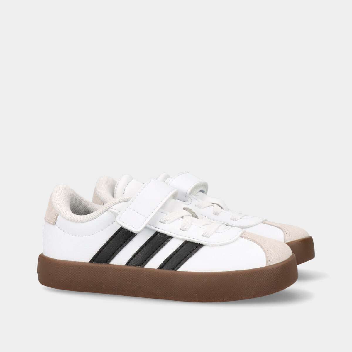 Tênis na cor branca com pormenores em preto e camurça, de velcro e cordão elástico.