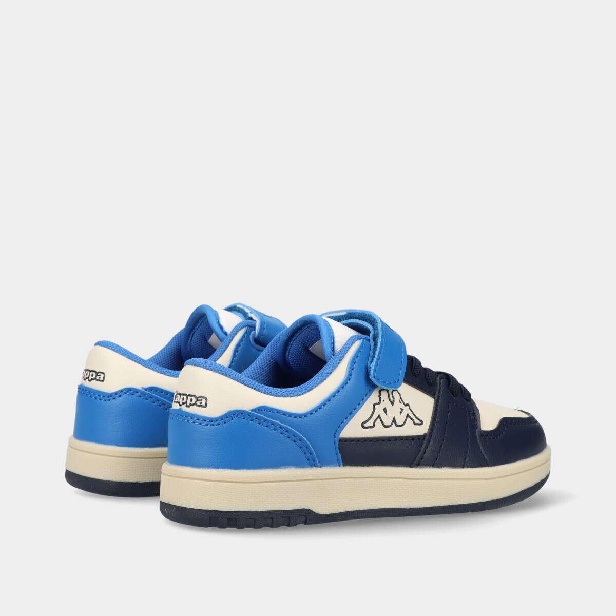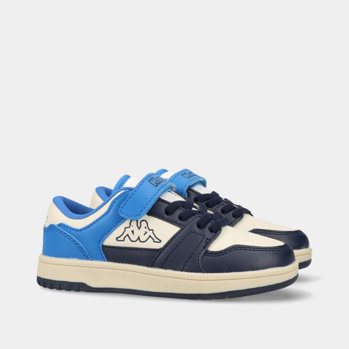 Tênis na cor azul e off-white em contraste, de velcro e cordão elástico.