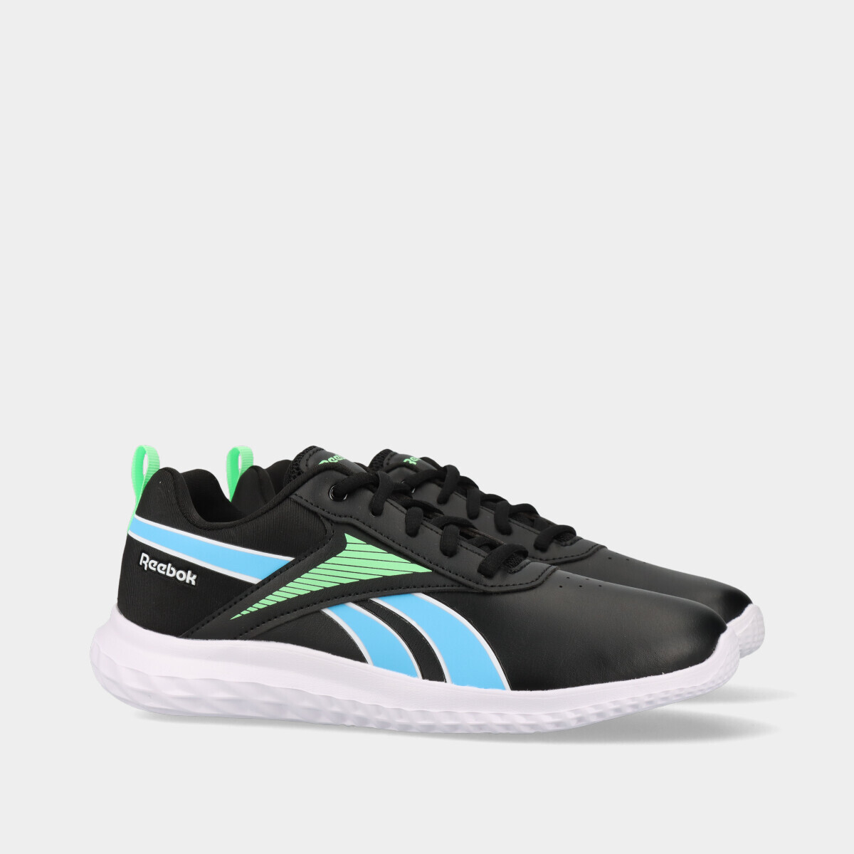 Ténis Reebok Rush Runner 5 Syn em preto e pormenores em contraste, com atacadores, ideais para uso diário e atividades desportivas. Confortáveis, leves e versáteis, oferecem desempenho fiável em qualquer ocasião.