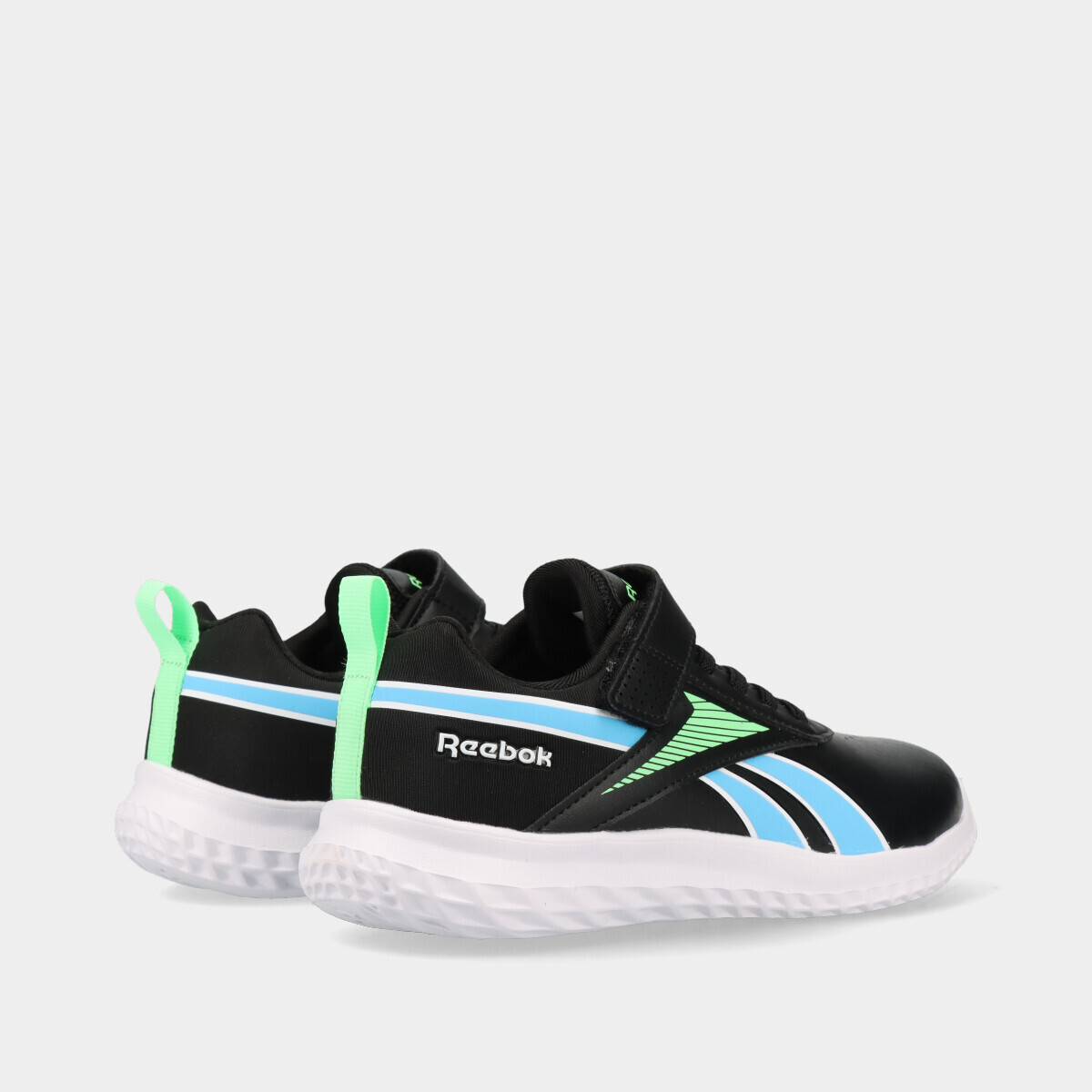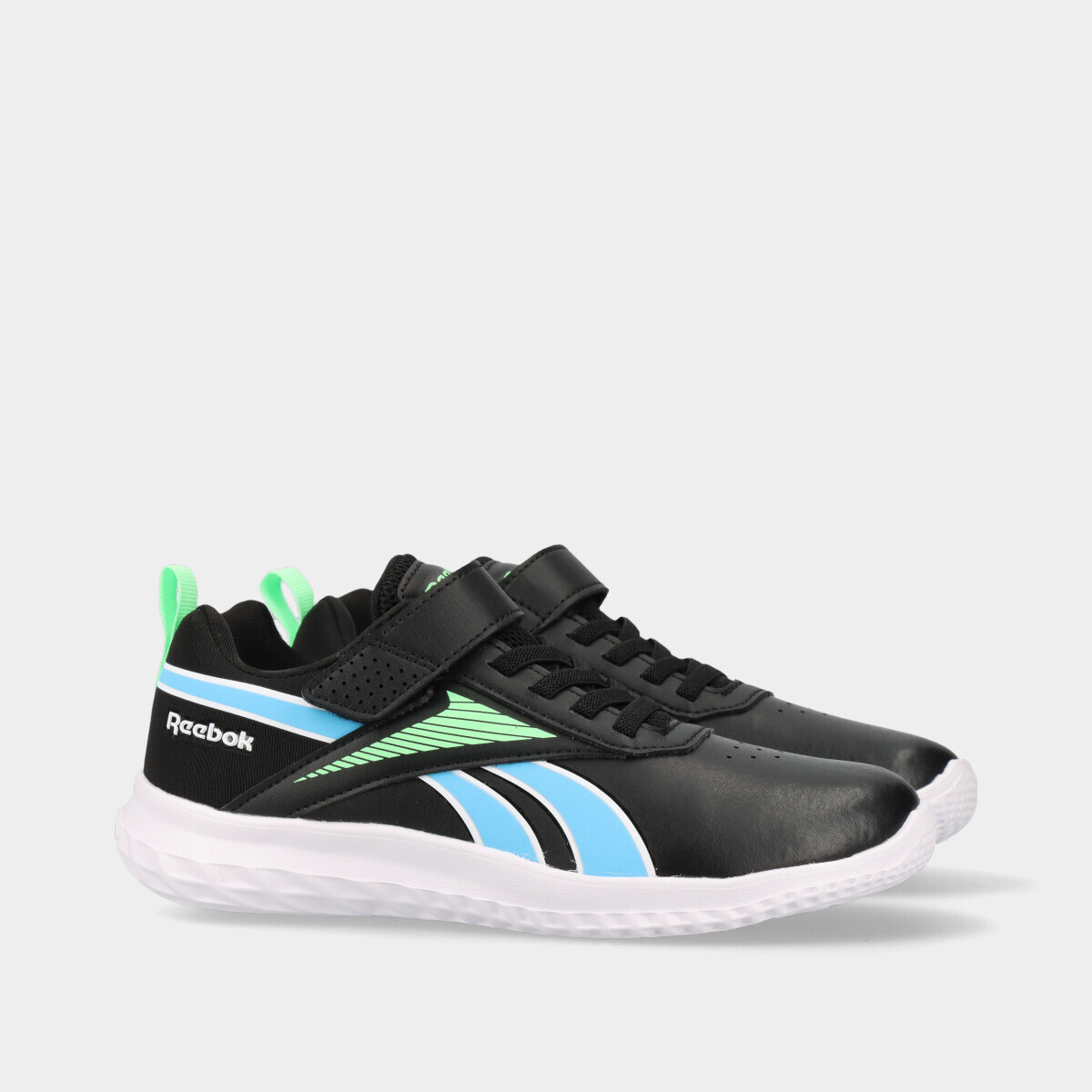 Ténis Reebok Rush Runner Syn em preto e pormenores em contraste, com atacadores elásticos e velcro, ideais para uso diário e atividades desportivas. Confortáveis, leves e versáteis, oferecem desempenho fiável em qualquer ocasião.