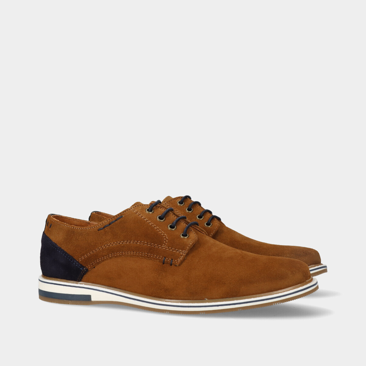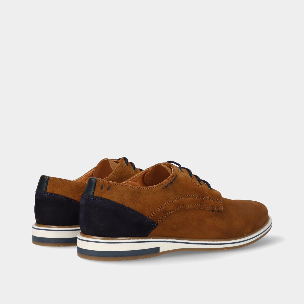 Sapato de cordão em pele camurça na cor camel com pormenor em azul.