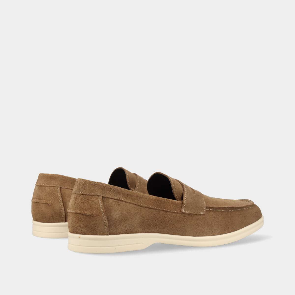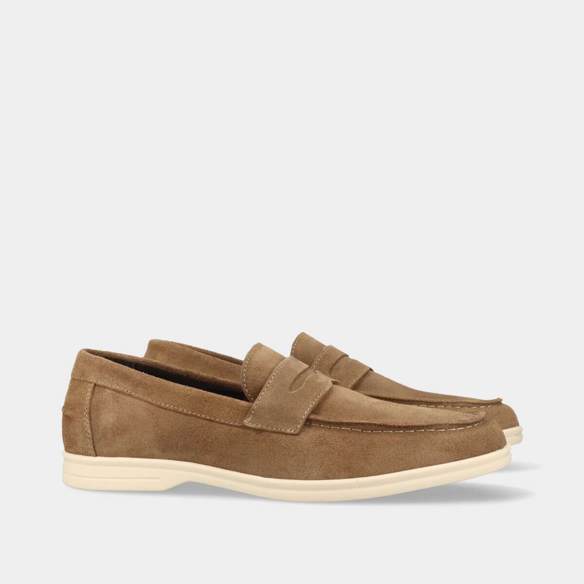 Mocassim em pele camurça taupe, com palmilha acolchoada para maior conforto.