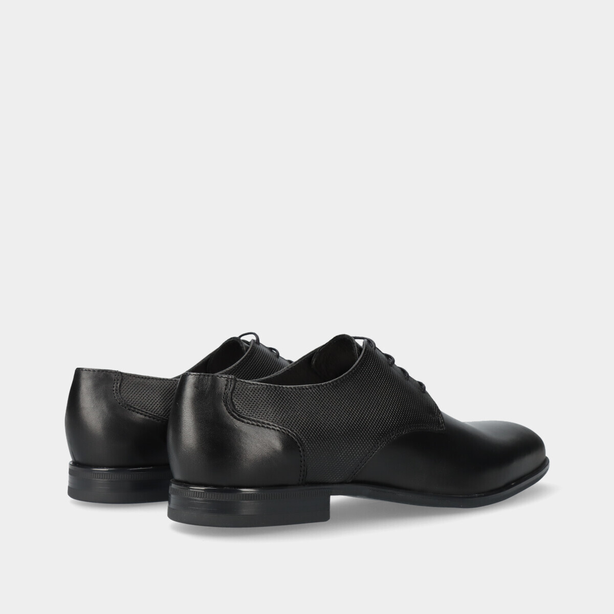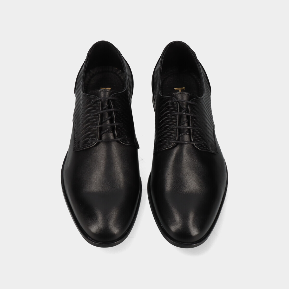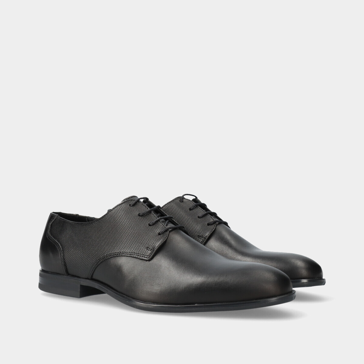 Sapato clássico de homem em pele preto, com pormenor texturizado nas laterais, cordões finos, biqueira redonda e sola de borracha. Perfeito para casamentos, cerimónias e outros eventos formais ou profissionais.