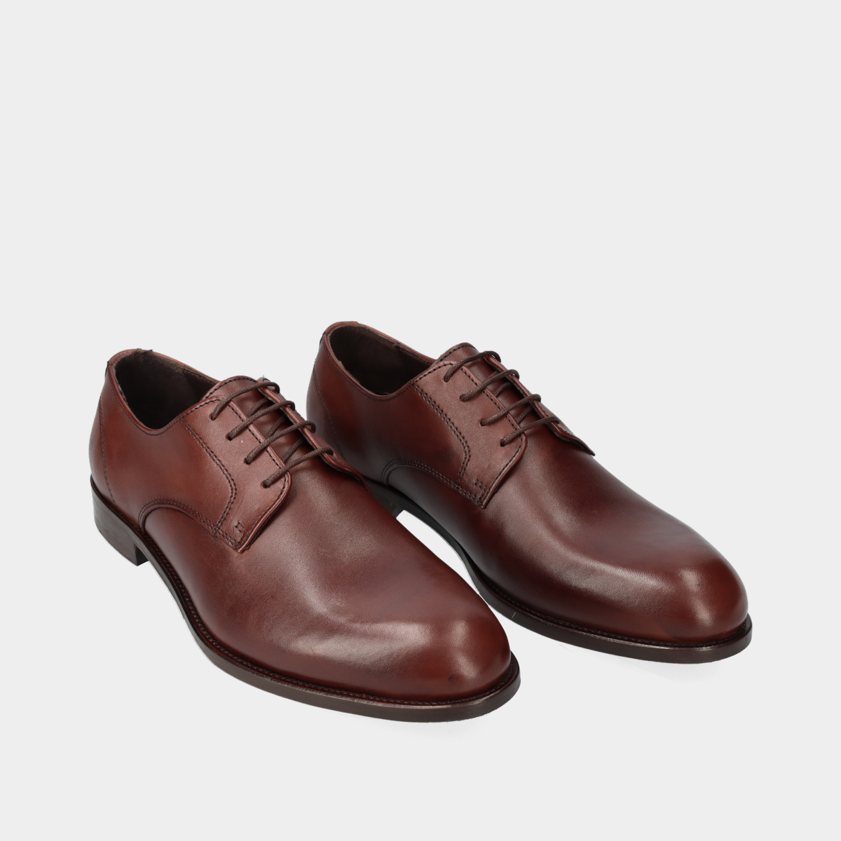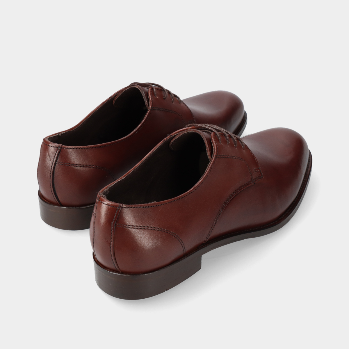 Sapatos clássicos de homem em pele castanha, com atacadores finos, biqueira redonda e sola pré-fabricada com rasto de borracha. Perfeitos para casamentos, cerimónias e outros eventos formais ou profissionais. Fabricados em Portugal com materiais de alta qualidade.