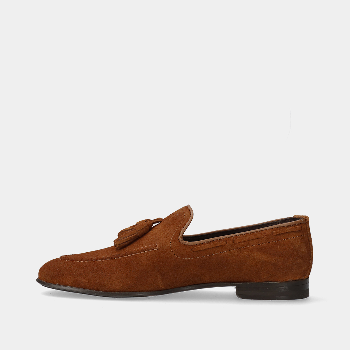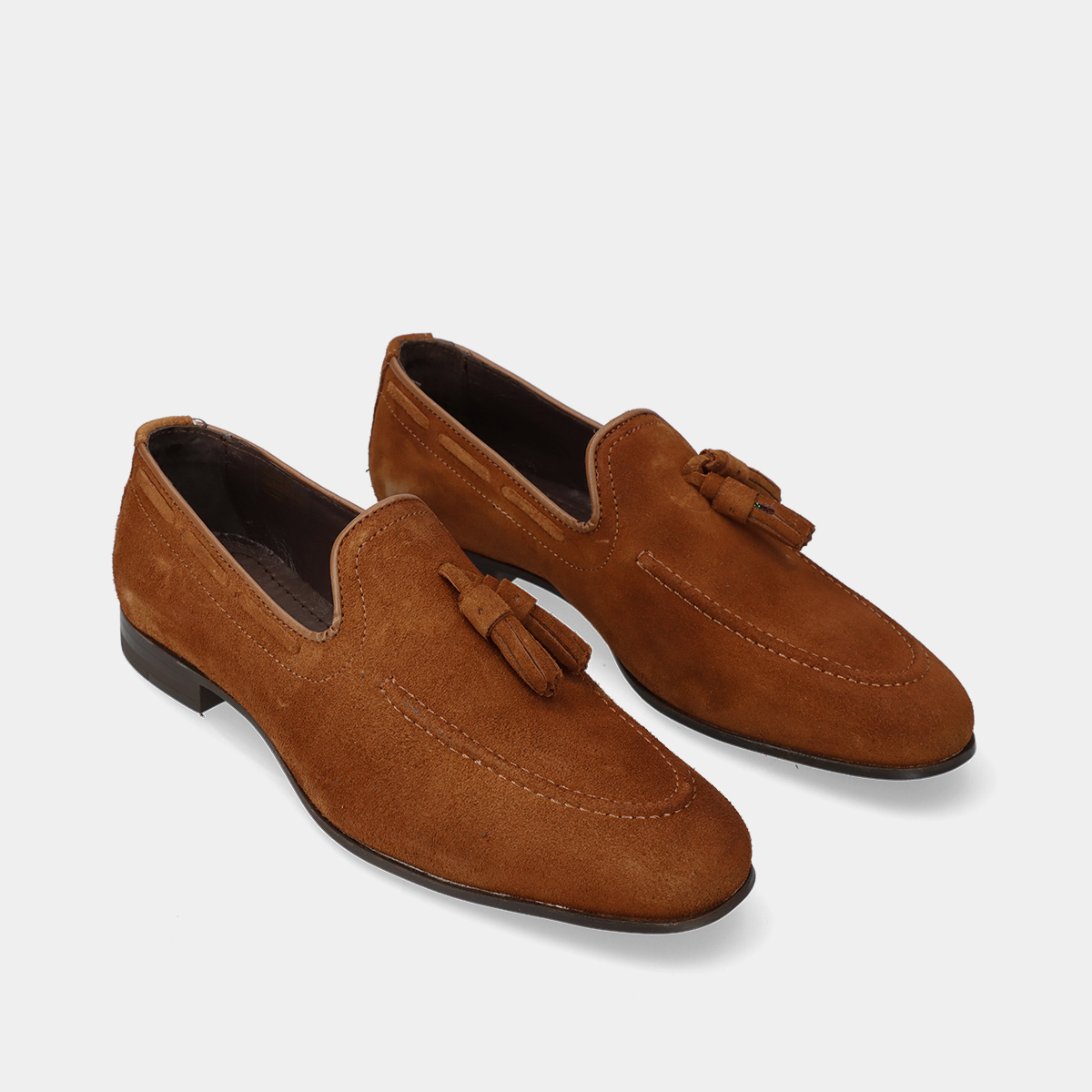 Mocassins de homem em pele camurça camel, com berloques, biqueira redonda e sola de borracha. Perfeitos para casamentos, cerimónias e outros eventos formais ou profissionais. Fabricados em Portugal com materiais de alta qualidade.