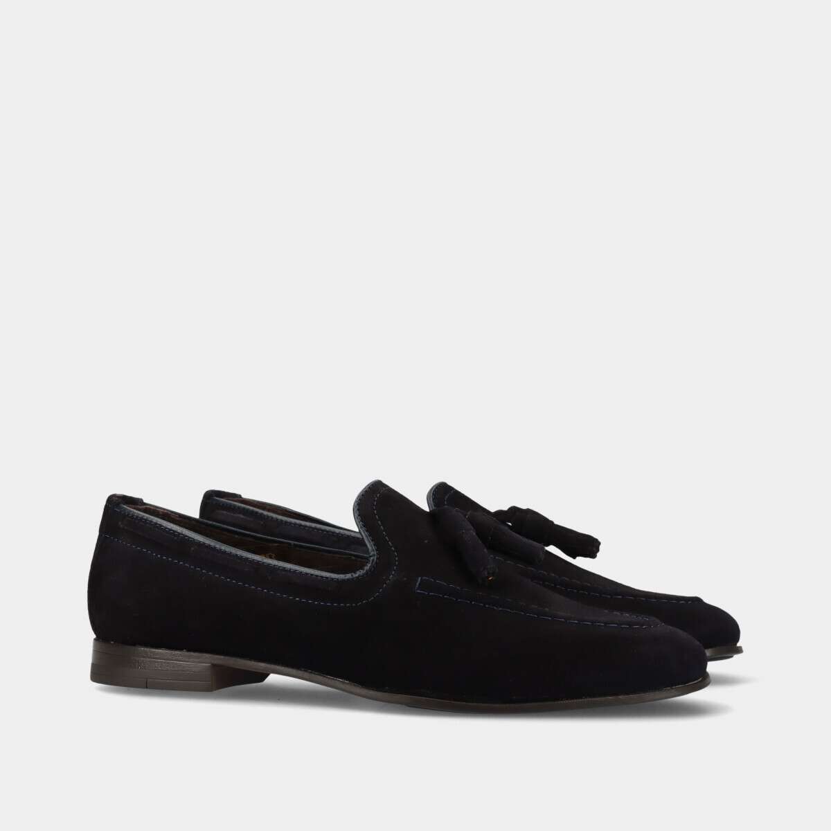 Sapato mocassim em pele camurça azul com berloques e palmilha acolchoada para maior conforto. Fabricado em Portugal.