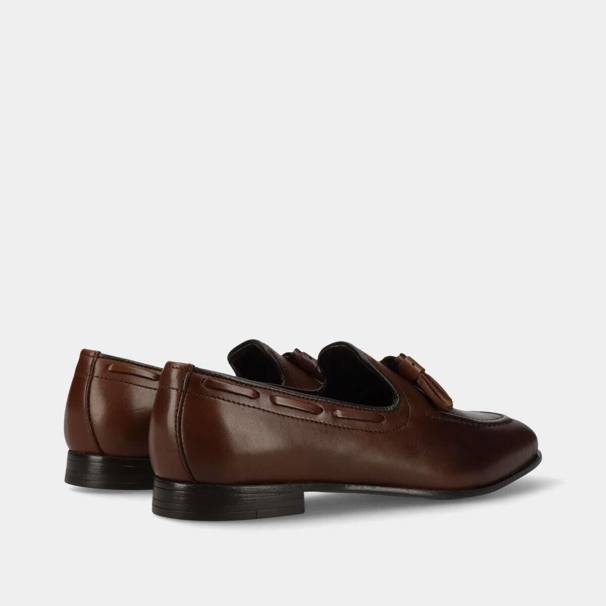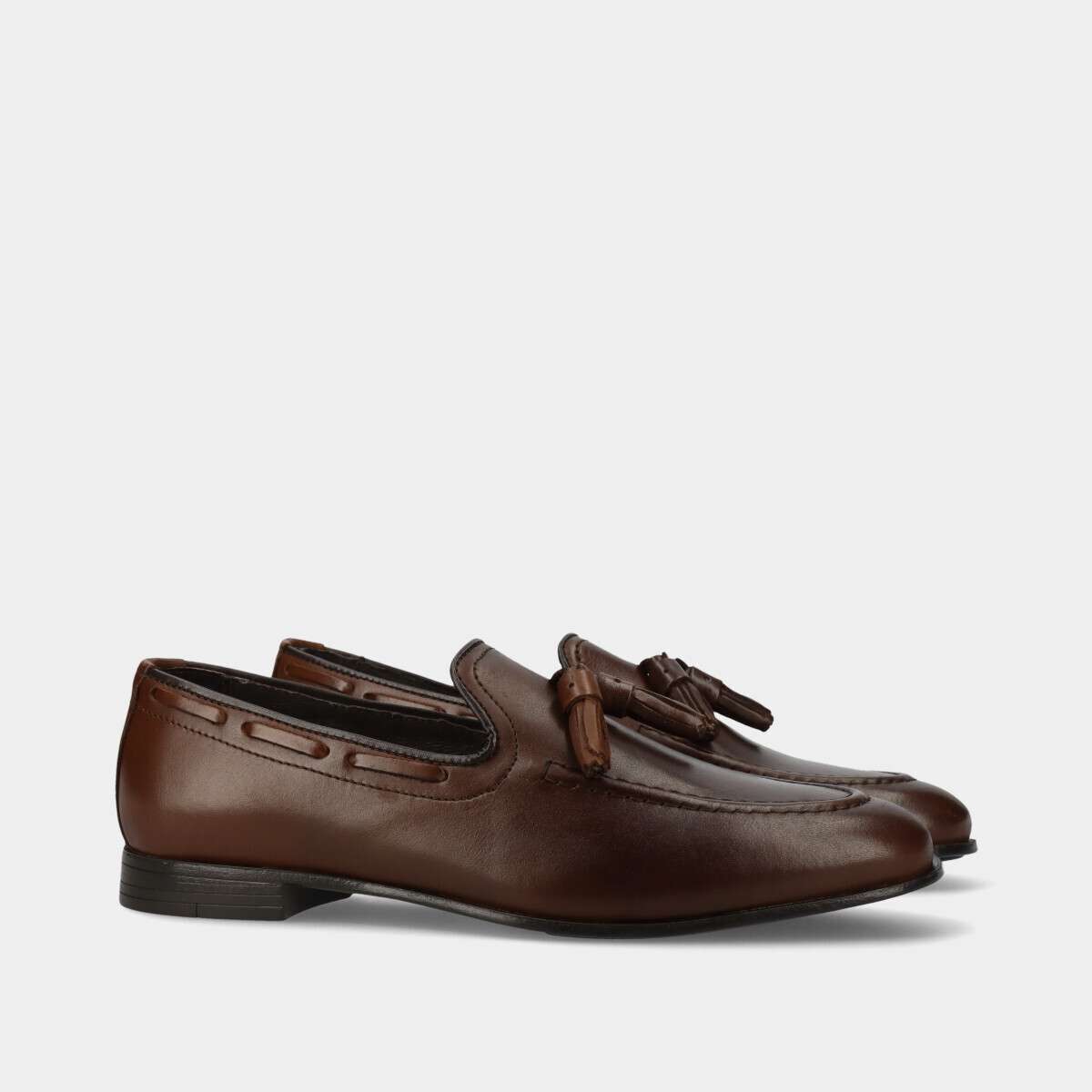 Sapato mocassim em pele castanha com berloques e palmilha acolchoada para maior conforto. Fabricado em Portugal.