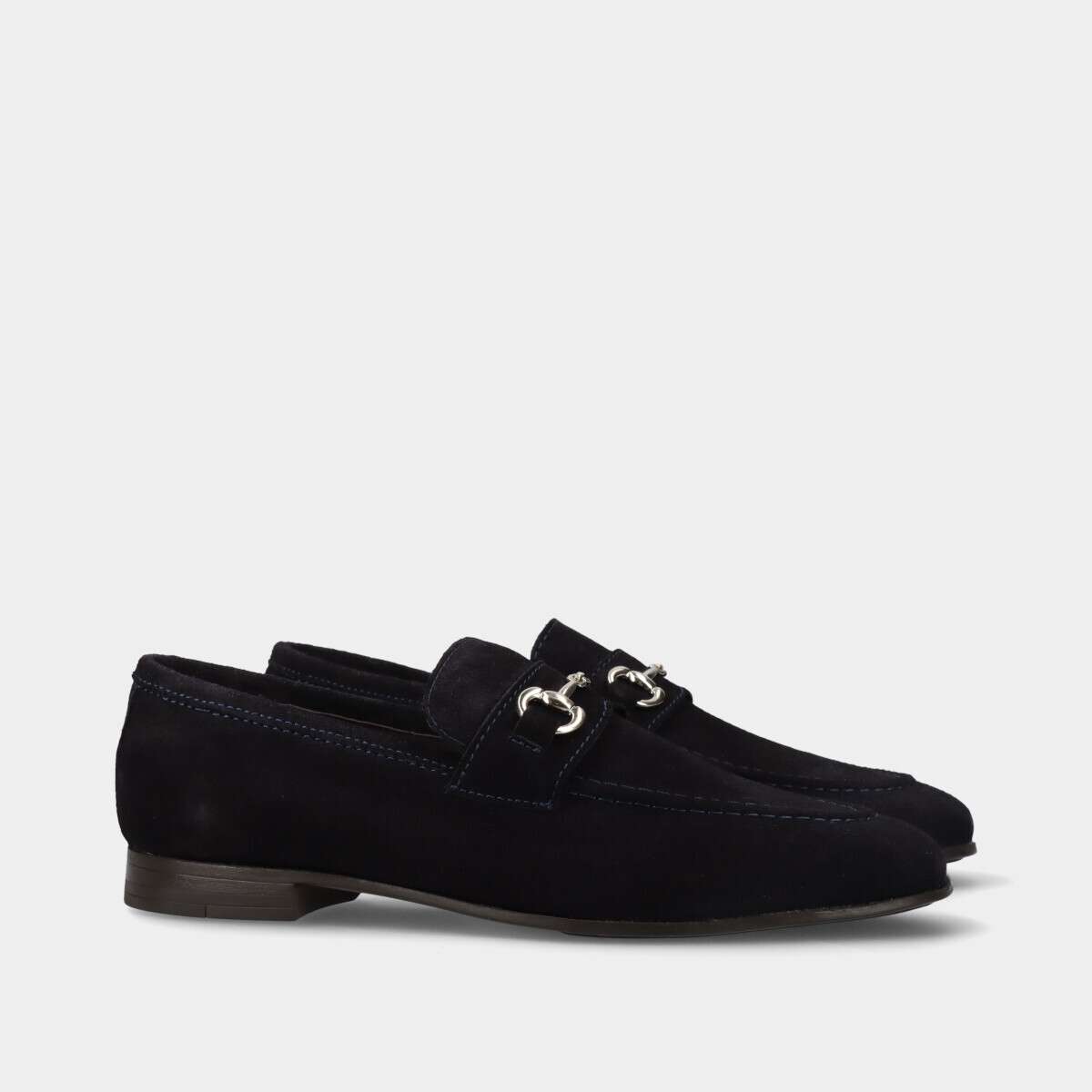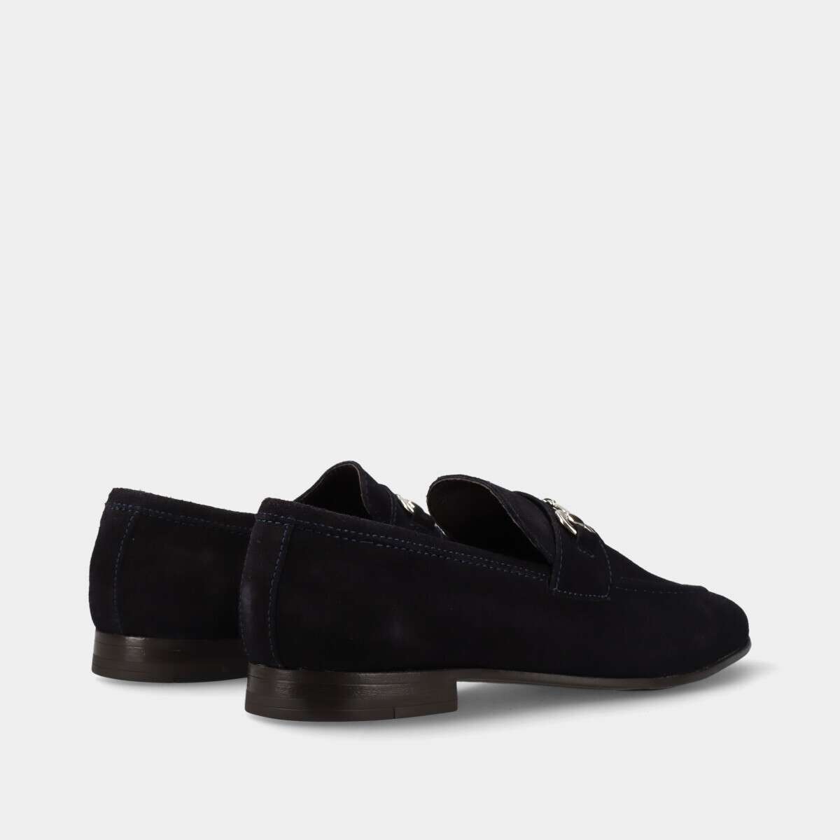 Sapato mocassim em pele camurça azul com aplicação prateada e palmilha acolchoada para maior conforto.