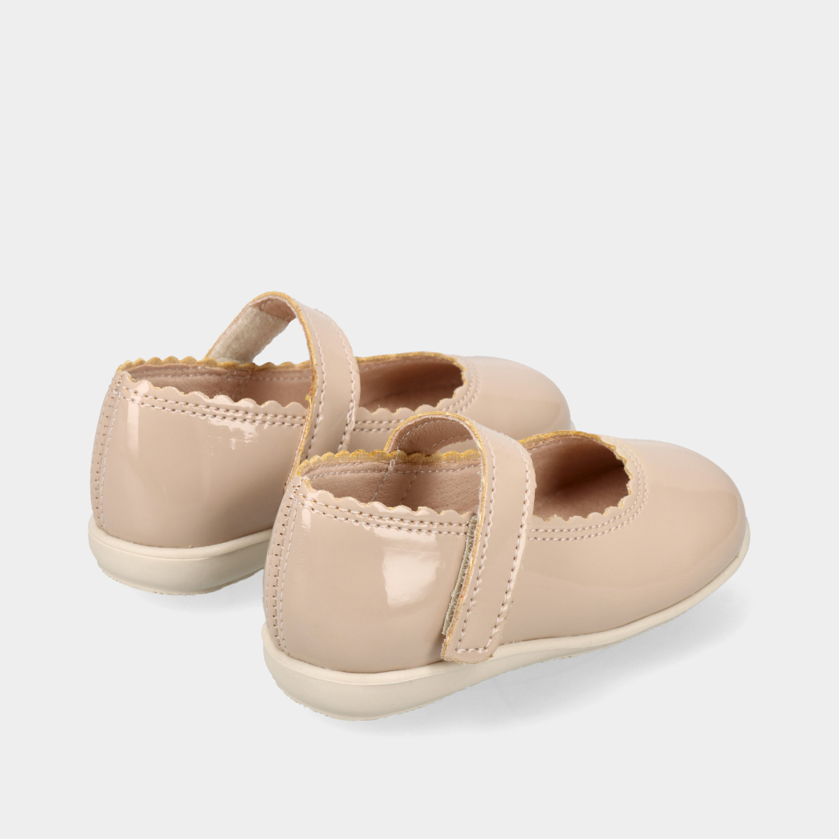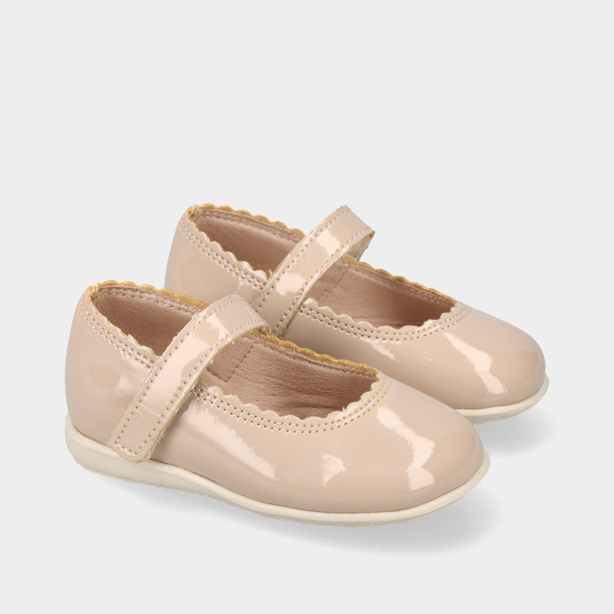 Sabrinas para menina de verniz bege com biqueira redonda e tira de velcro no peito do pé para um ajuste prático e seguro. Palmilha confortável e interior macio para maior bem-estar. Sola de borracha flexível e resistente. Ideais para cerimónias, festas ou uso elegante no dia a dia.