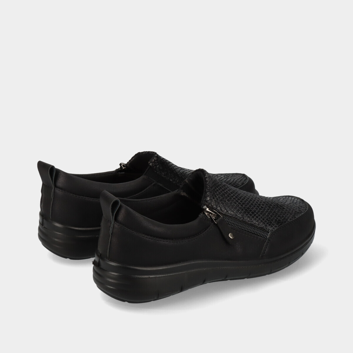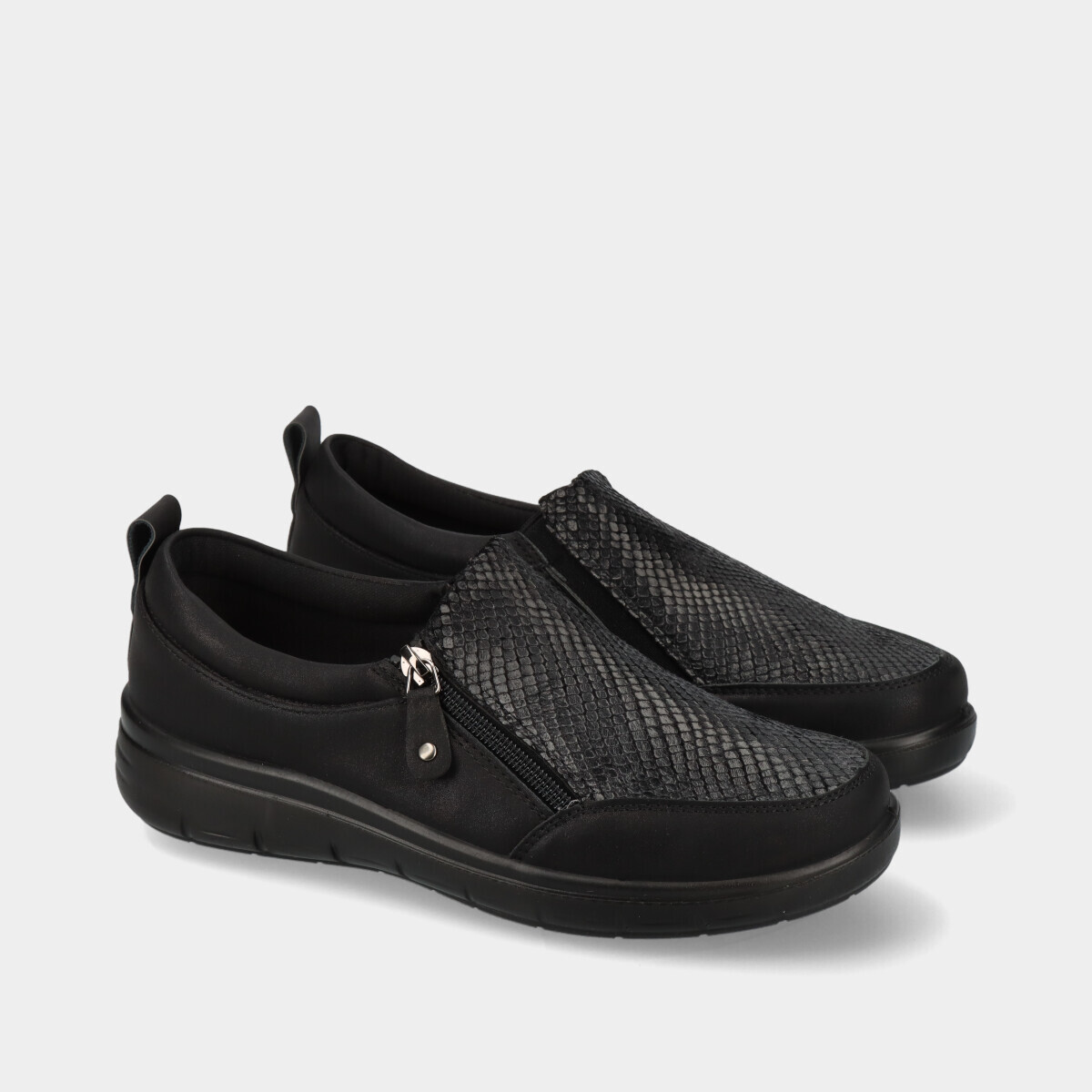 Sapatos para mulher em preto com acabamento brilhante, palmilha em pele macia, elástico e fecho para ajuste prático.