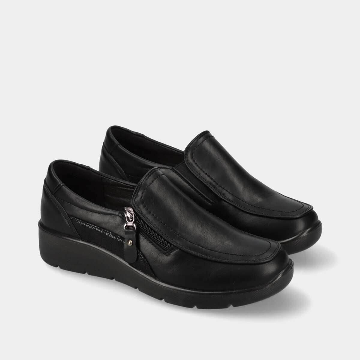 Sapatos para mulher em preto com pequena cunha e efeito pele, palmilha em pele macia, elástico e fecho para ajuste prático.