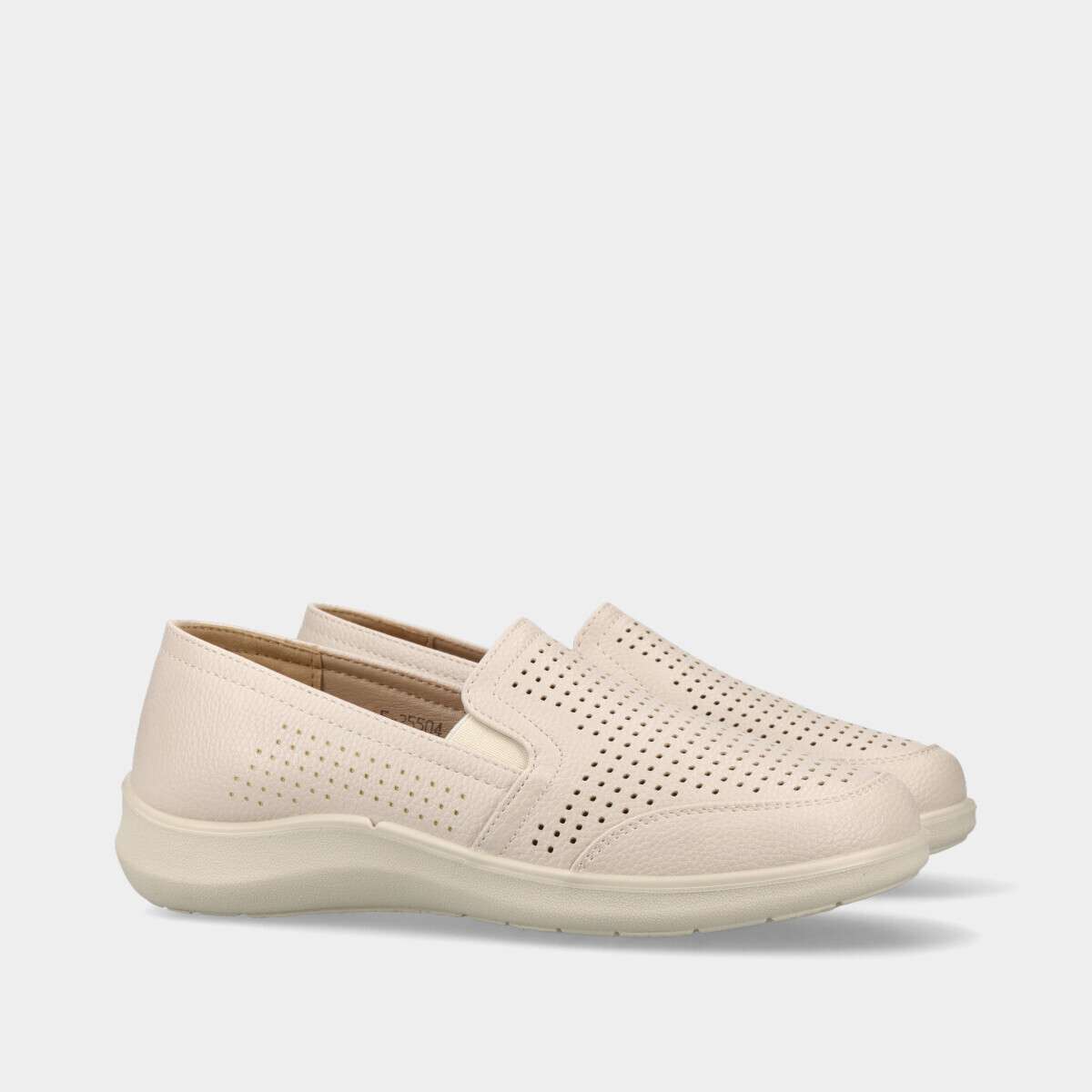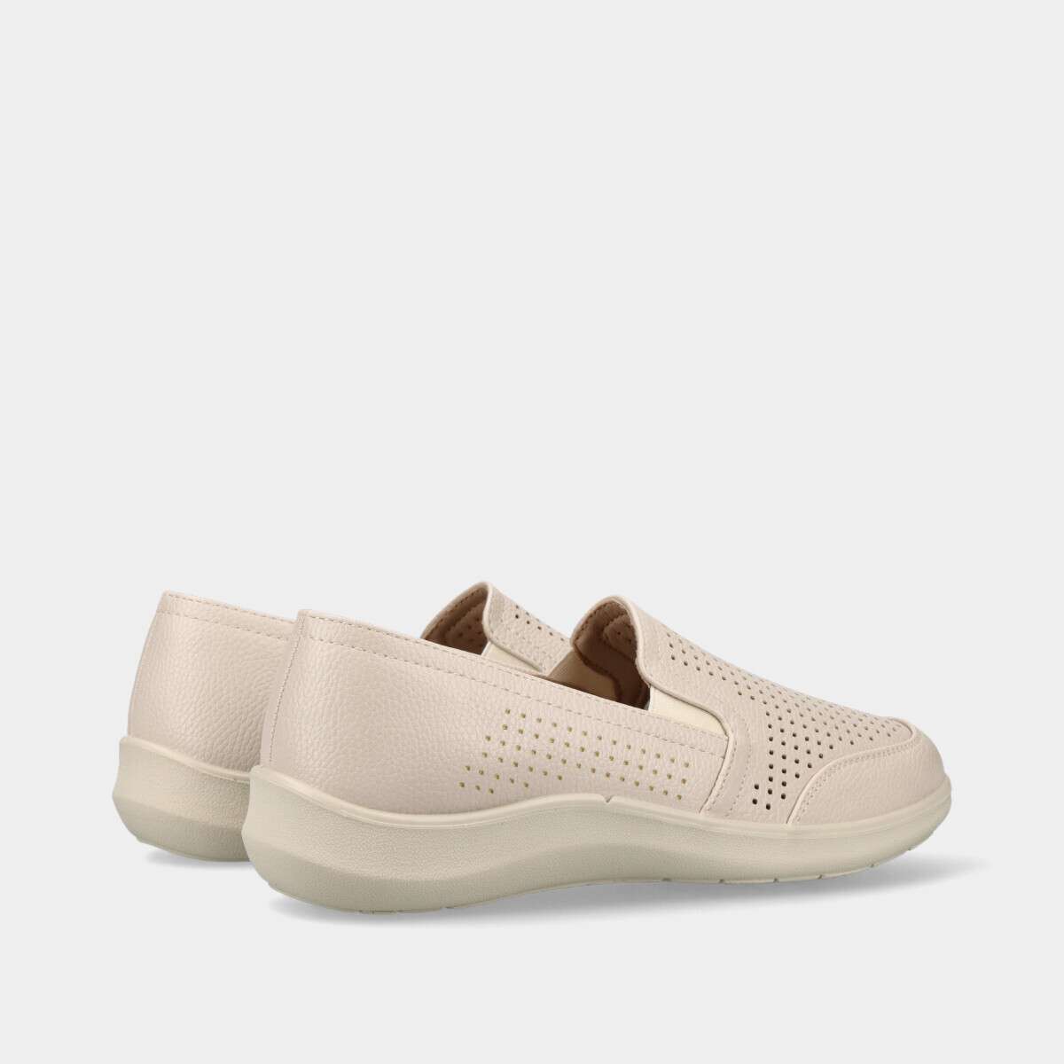 Sapato em bege claro com perfurações e elásticos nas laterais para fácil ajuste.