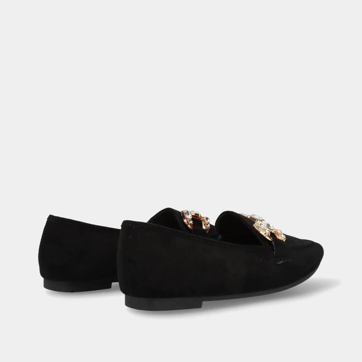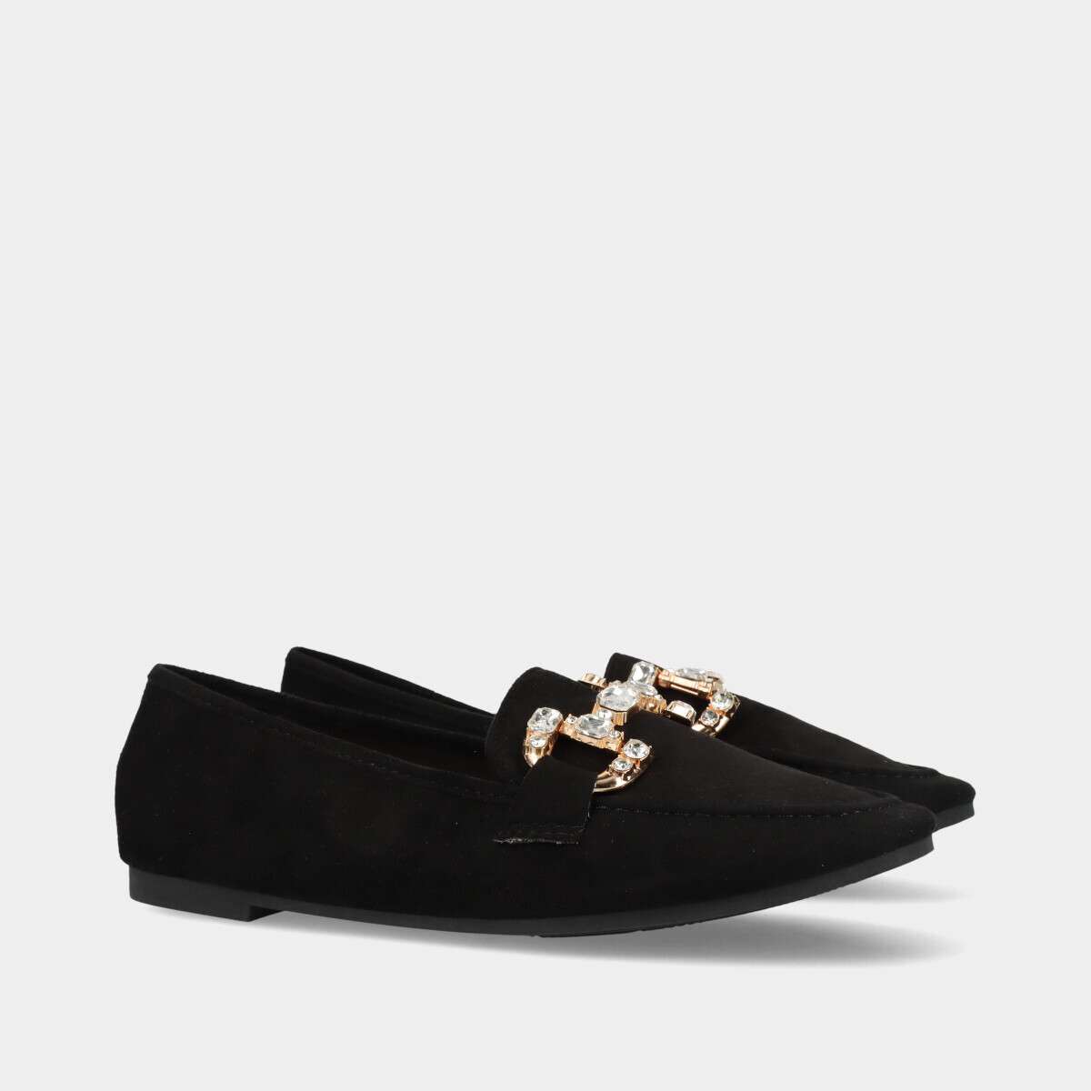 Sapato casual na cor preta com palmilha confortável e aplicação de pedras brilhantes no peito do pé.