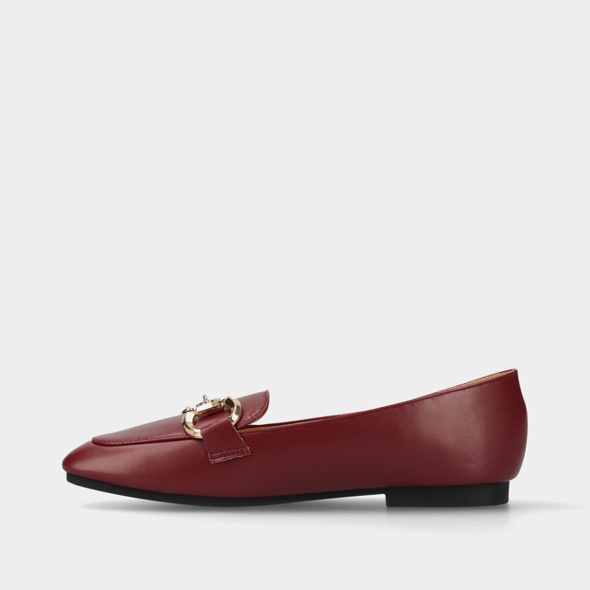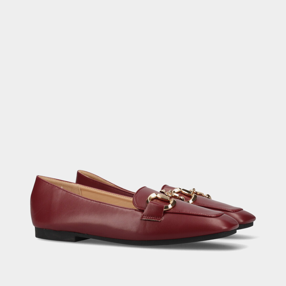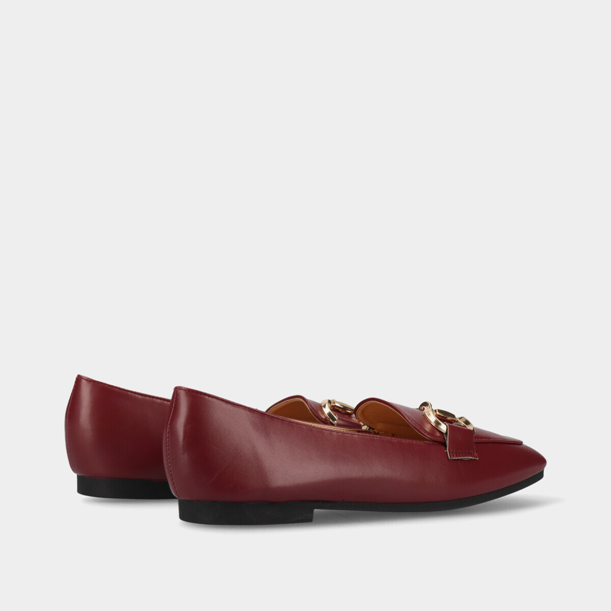 Sapato casual para mulher na cor bordô, com palmilha confortável e aplicação dourada no peito do pé.