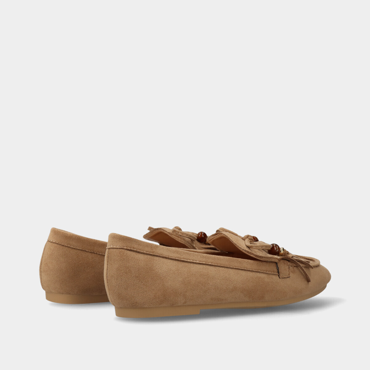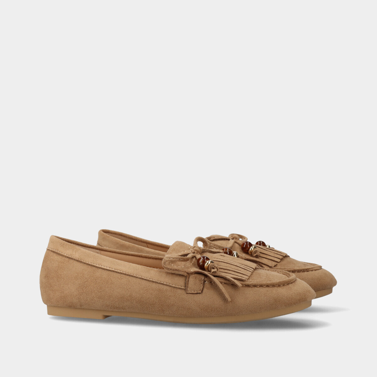 Sapato estilo loafer com franja para mulher com efeito camurça, aplicações decorativas, biqueira redonda e palmilha confortável. Modelo fácil de calçar, com sola de borracha flexível que proporciona maior comodidade ao caminhar.