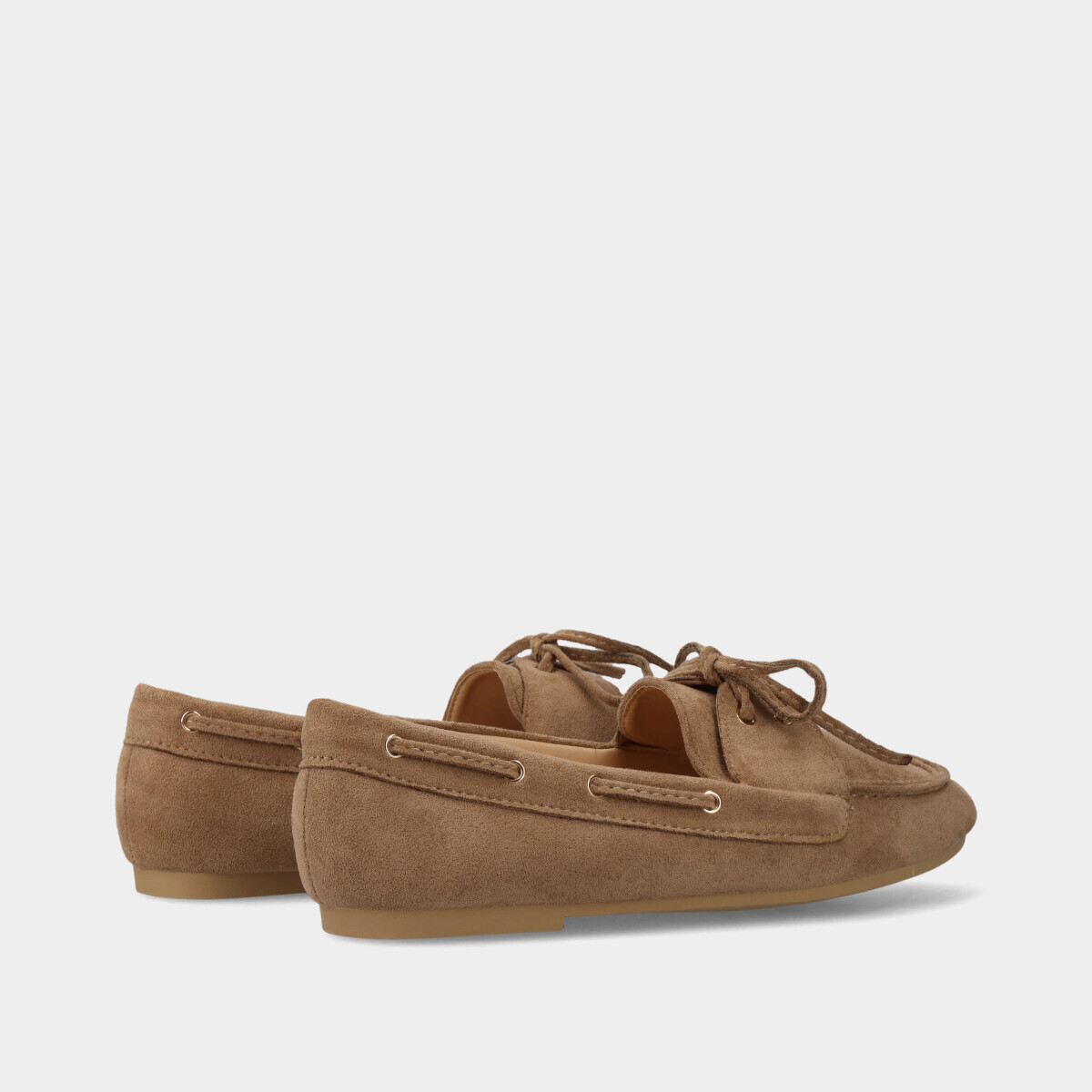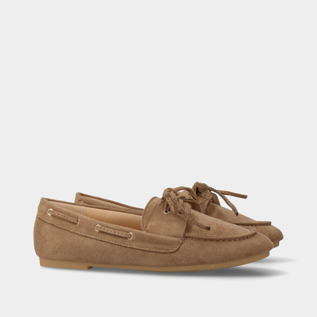 Mocassim de vela para mulher com efeito camurça taupe, atacadores ajustáveis, biqueira redonda e palmilha confortável. Sapatos femininos fáceis de calçar e versáteis para o dia a dia, trabalho e looks casuais, com design clássico e sofisticado este modelo é a escolha ideal para looks modernos e confortáveis.