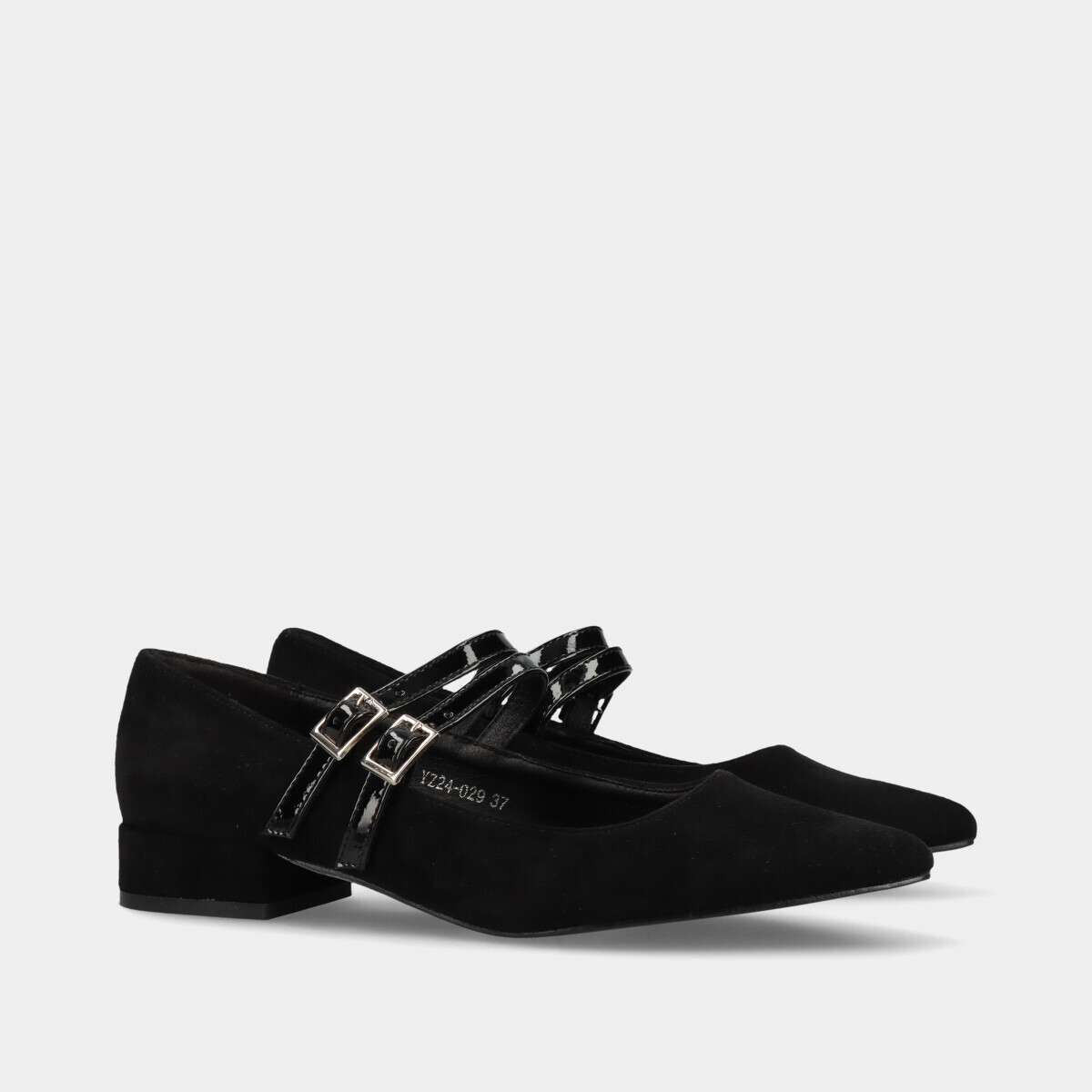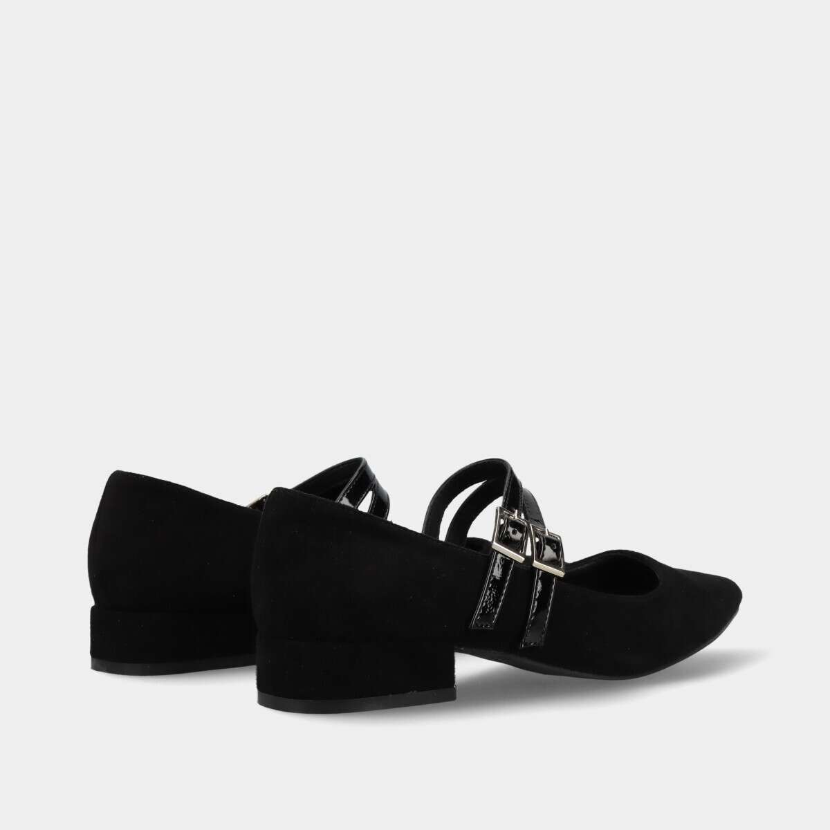 Sapato confortável na cor preta com duas tiras com fecho de fivela e palmilha de espuma.