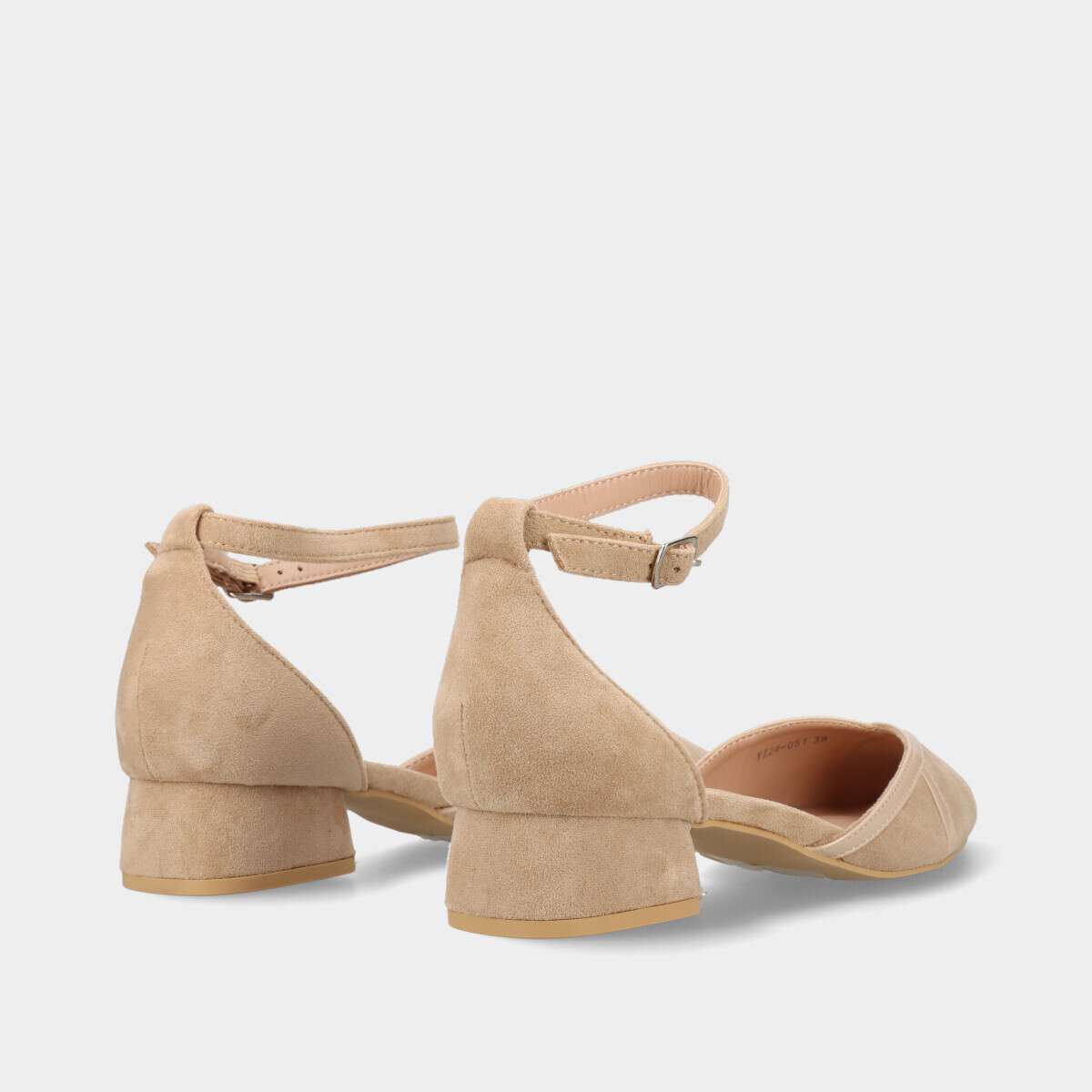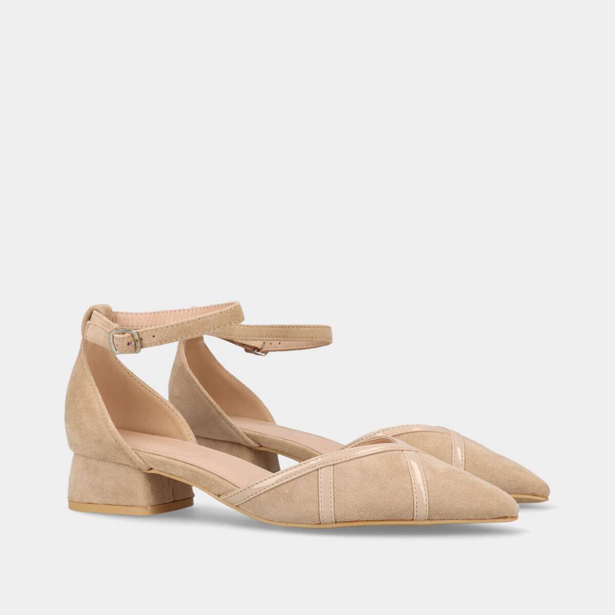 Sapato na cor bege com fivela lateral para fácil ajuste.