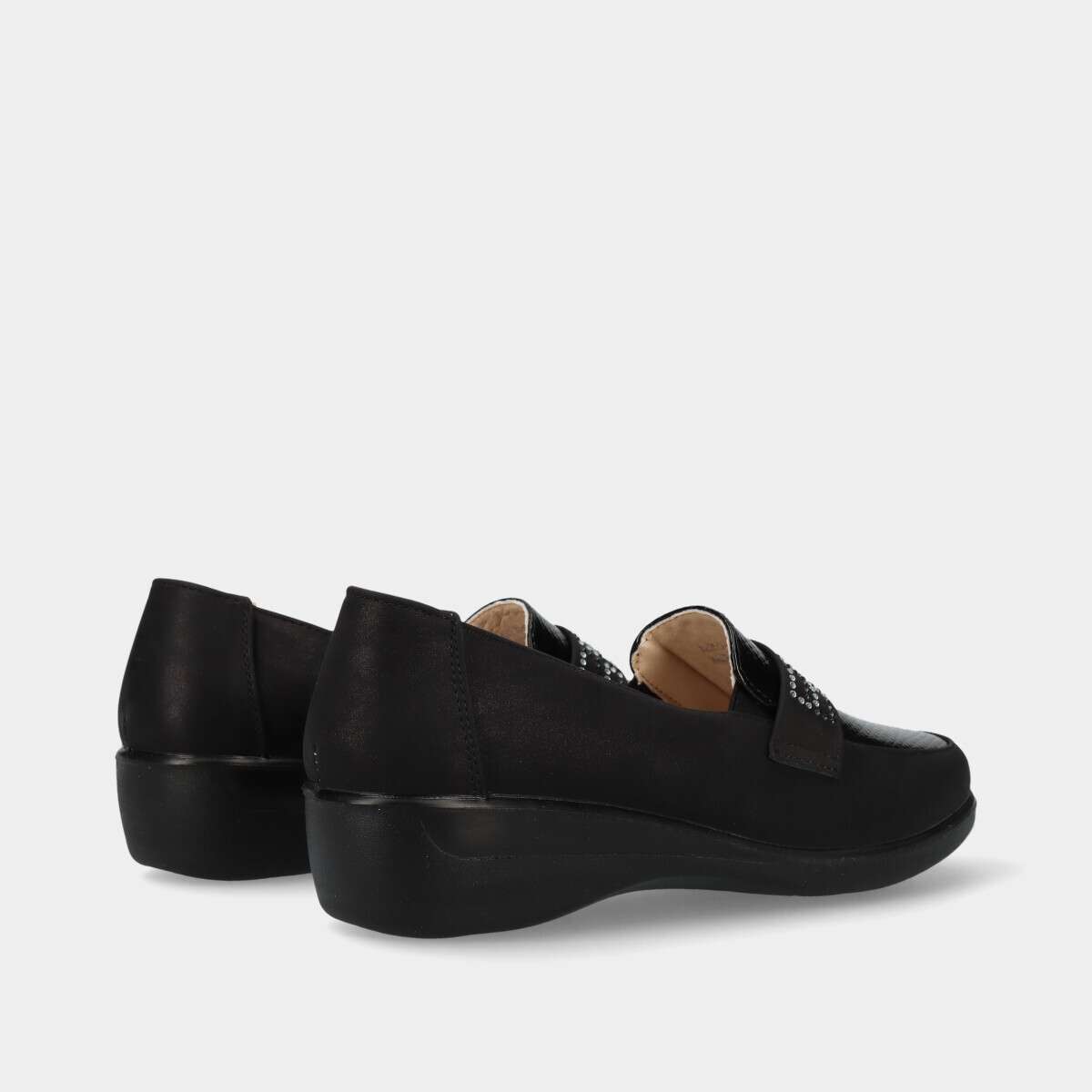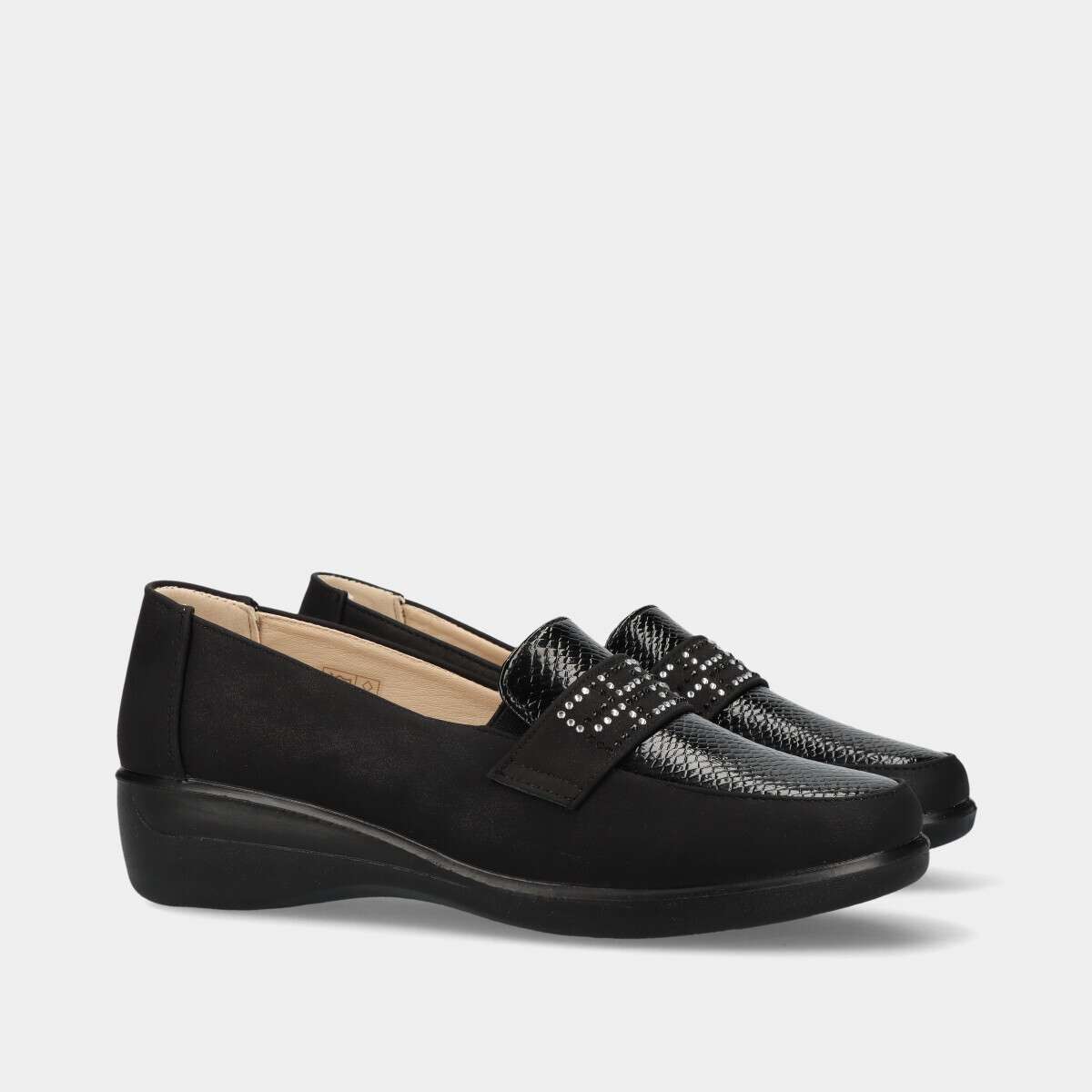 Sapato na cor preta brilhante com pedras brilhantes e palmilha confortável.