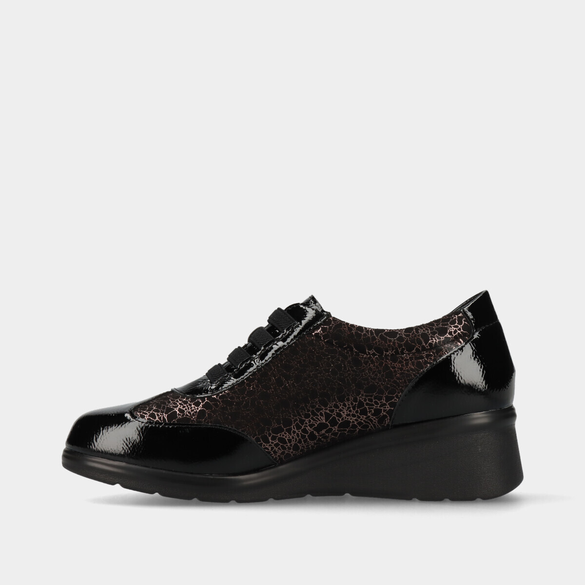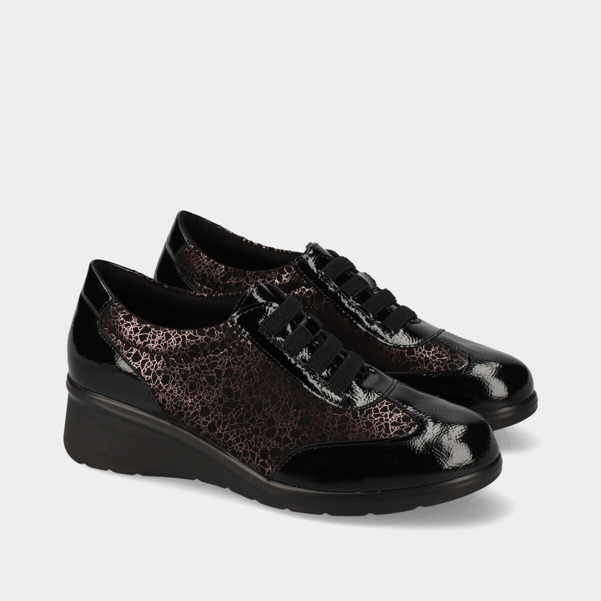 Sapatos de conforto para mulher em preto, com pequena cunha, palmilha acolchoada, e elástico para ajuste fácil, ideais para uso diário.