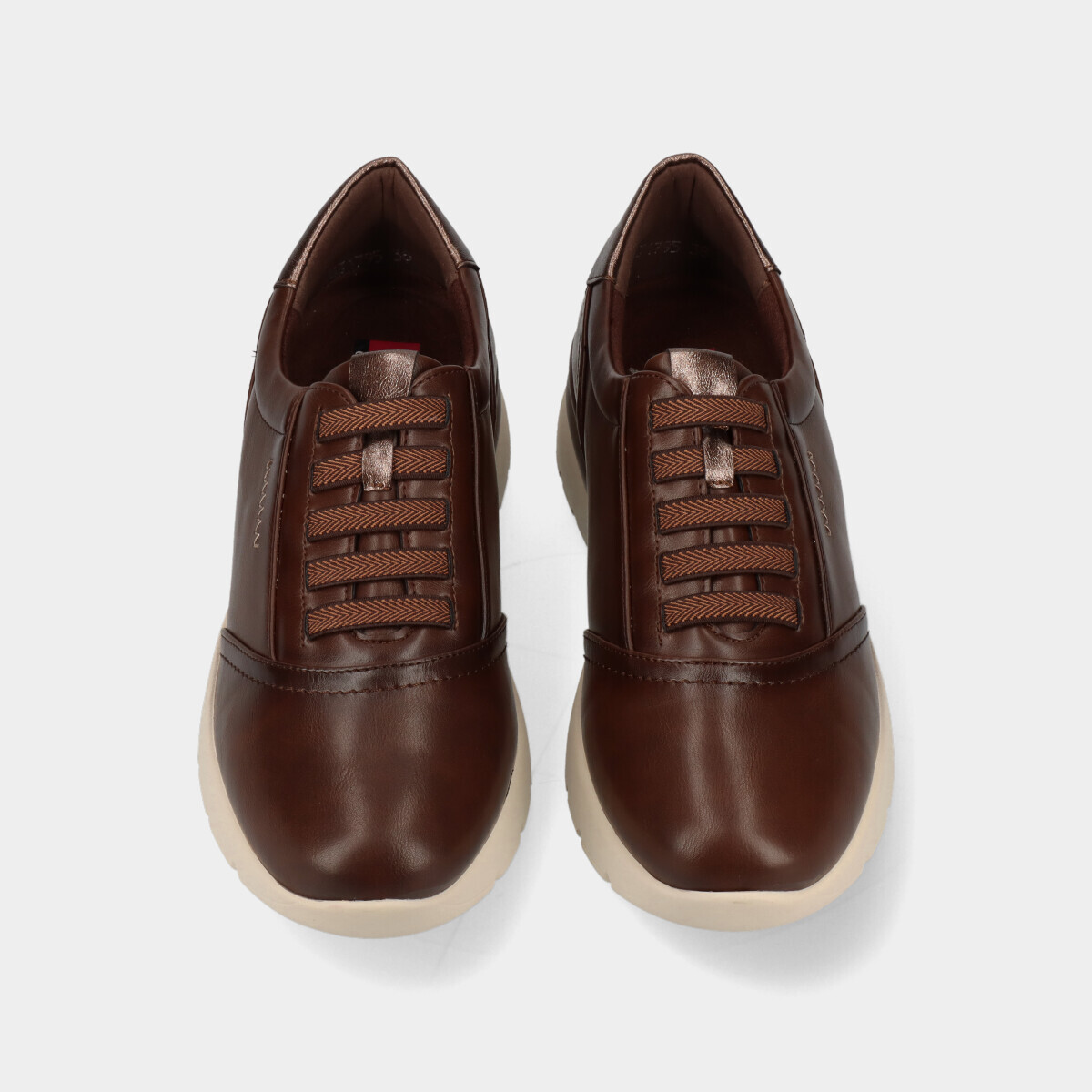 Sapatos de conforto para mulher em castanho, com pequena cunha, palmilha acolchoada, e elástico para ajuste fácil, ideais para uso diário.