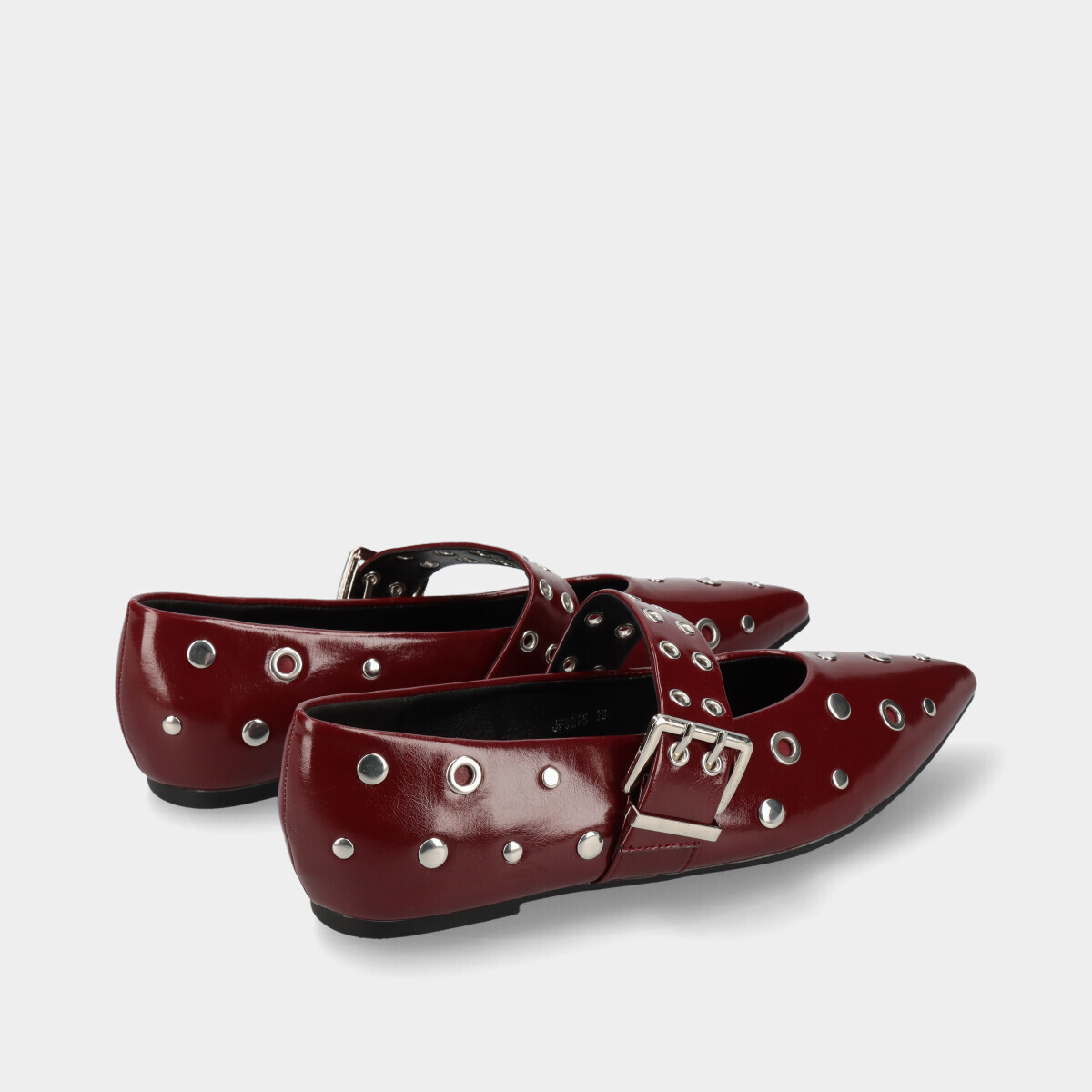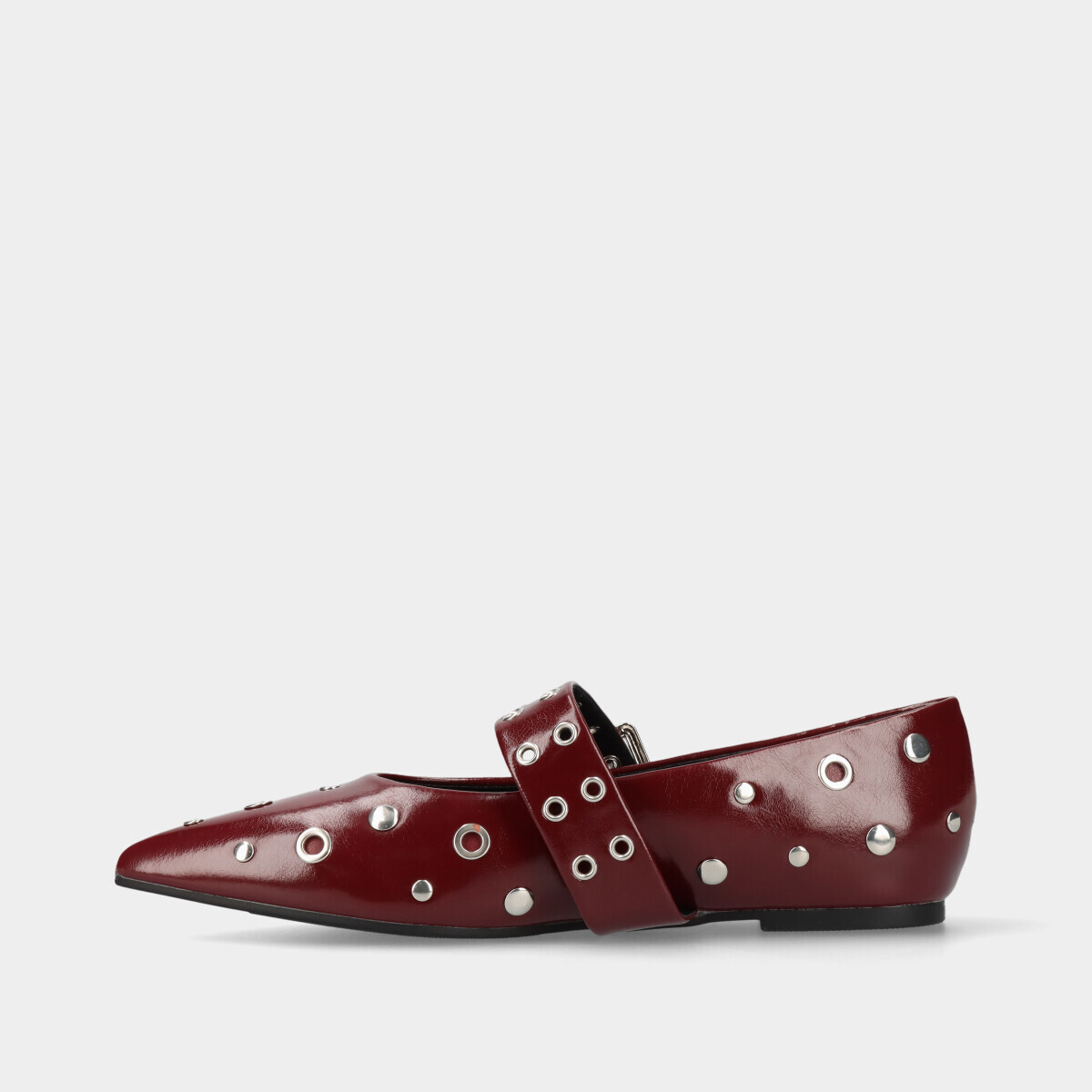Sapatos rasos estilo Mary Jane na cor bordô, com tachas prateadas e fivela lateral ajustável. Perfeitos para criar looks modernos e sofisticados.