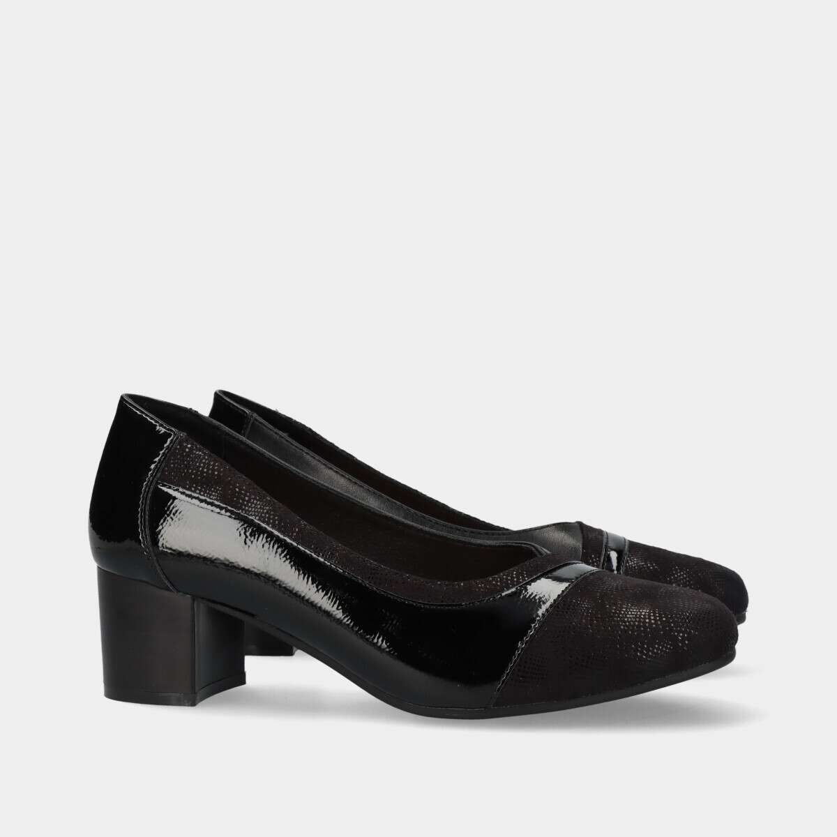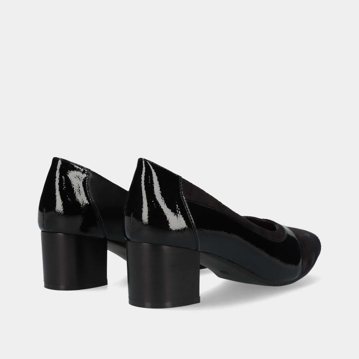 Sapato na cor preta com efeito verniz, salto quadrado e palmilha almofadada.