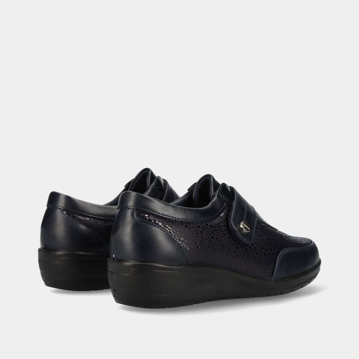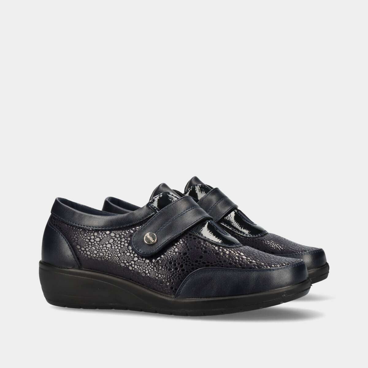 Sapato confortável na cor azul com velcro no peito do pé para fácil ajuste.