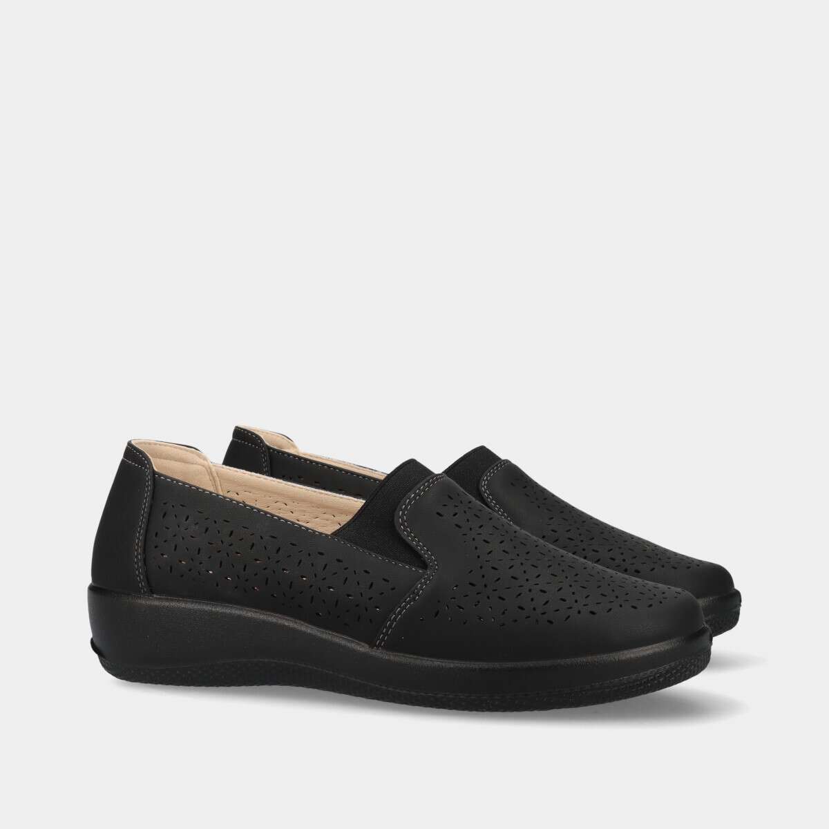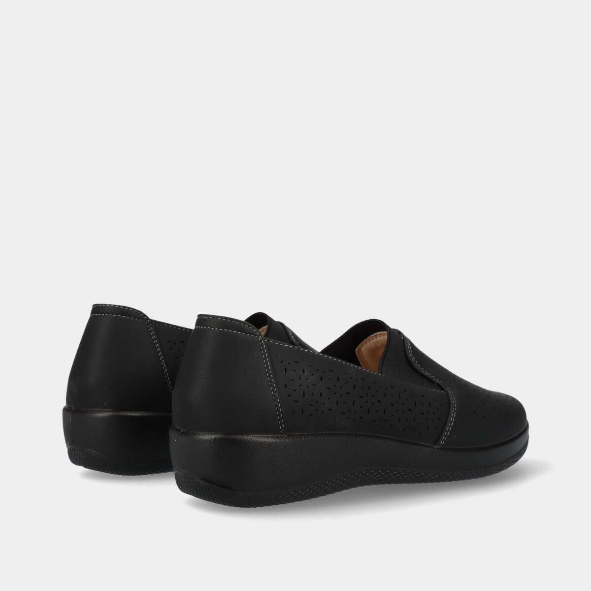 Sapato confortável na cor preta com elástico no peito do pé para fácil ajuste.