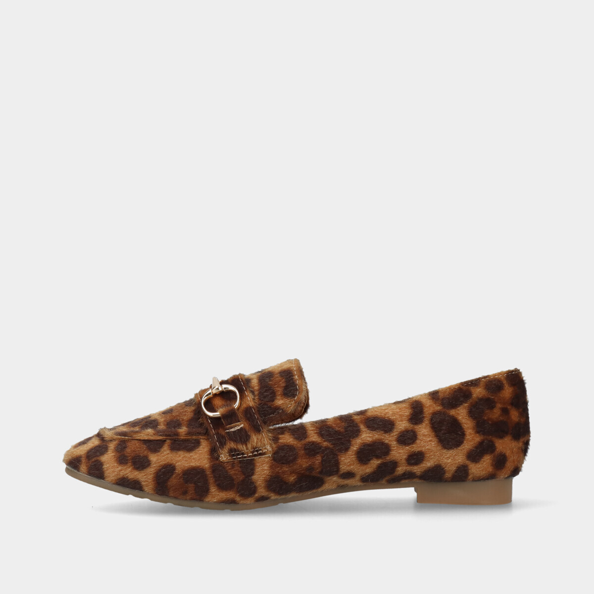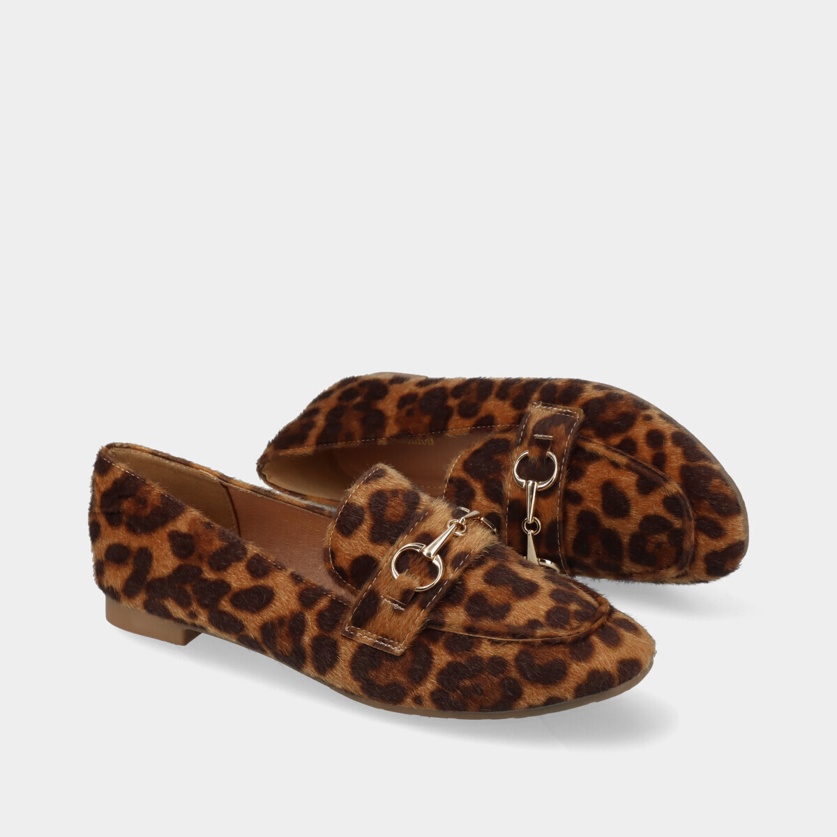 Mocassins para mulher com padrão animal print leopardo e aplicação dourada no peito do pé. Leves, práticos e confortáveis, ideais para o dia a dia.