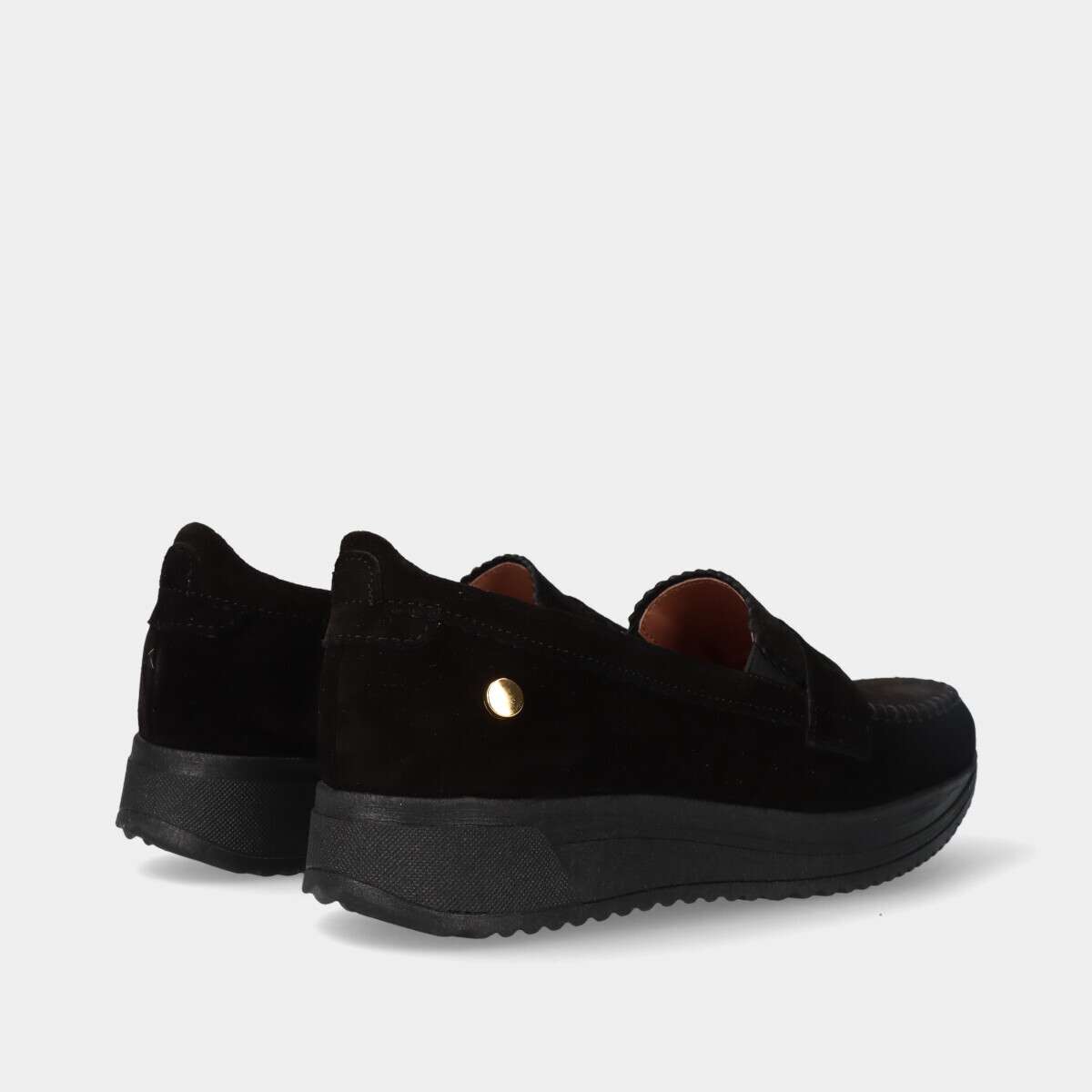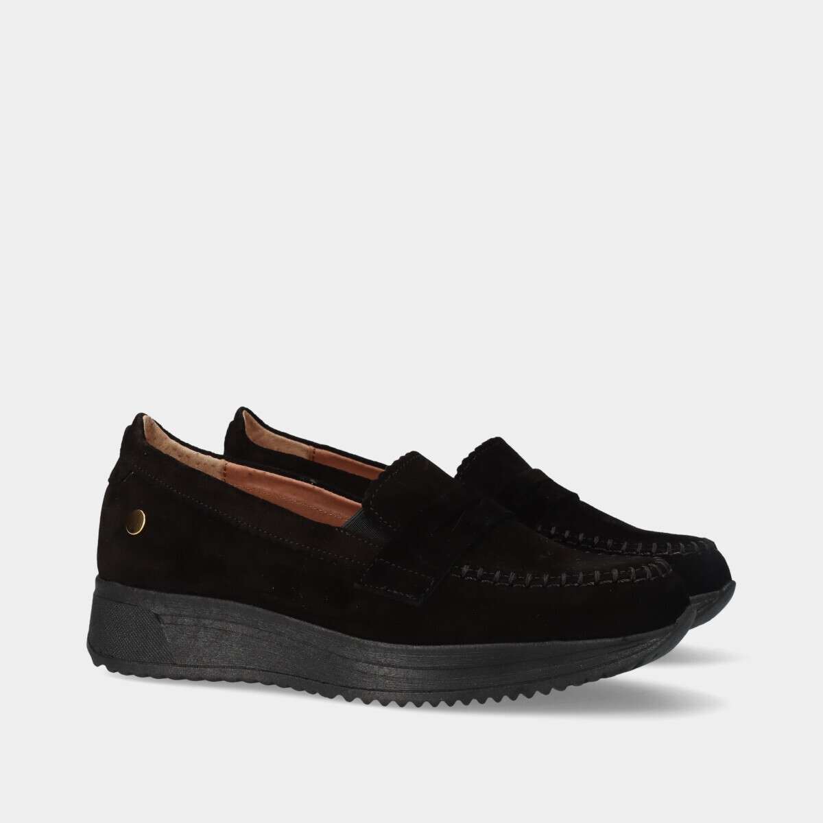 Sapato em pele camurça na cor preta com elástico nas laterais.