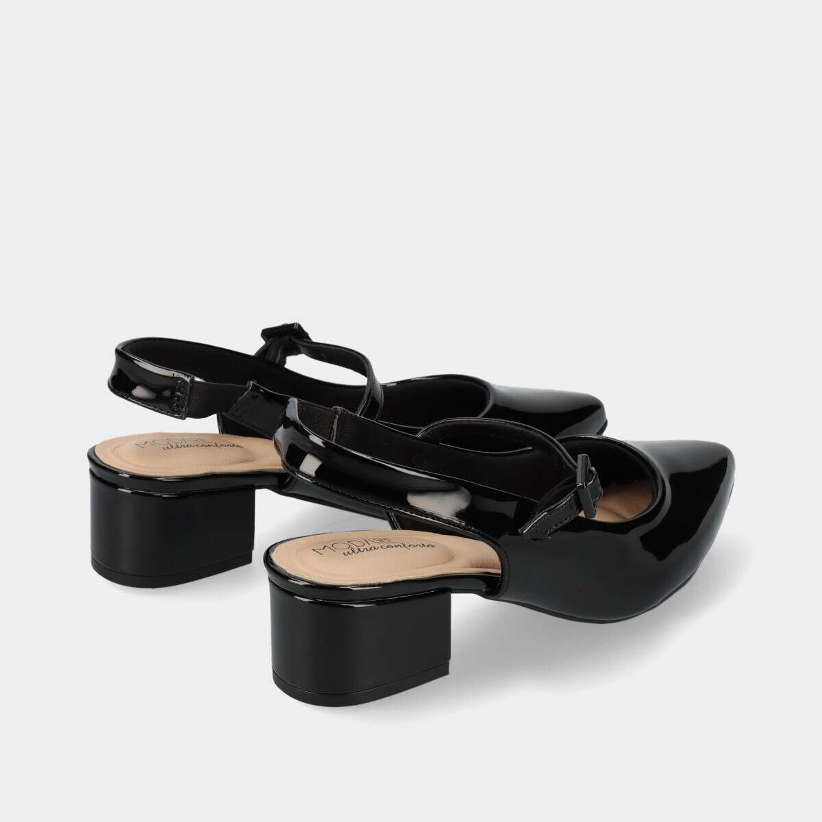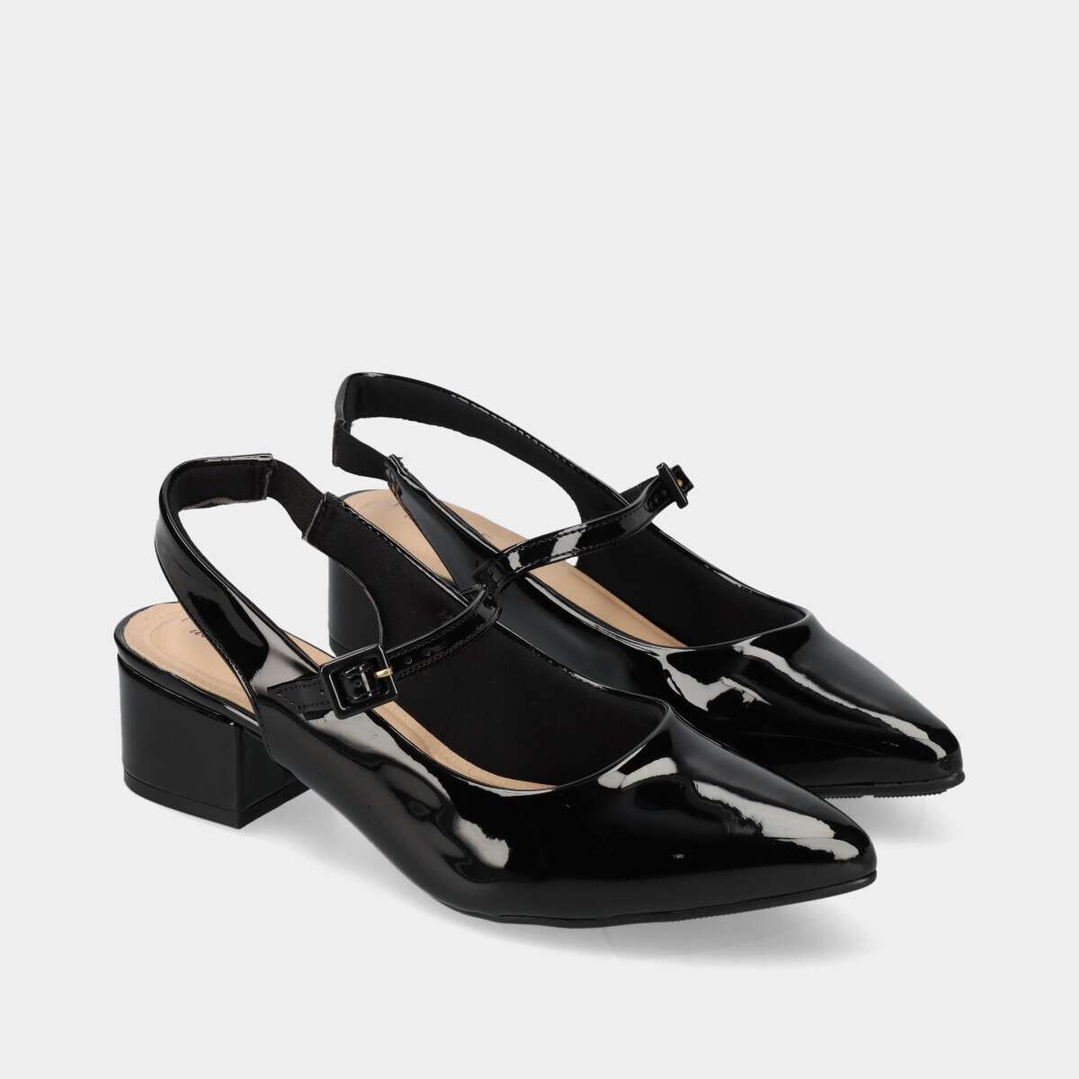 Sapato na cor preta com acabamento em verniz, ponta em bico, tira traseira com elástico e tira sobre o peito do pé com fivela ajustável.