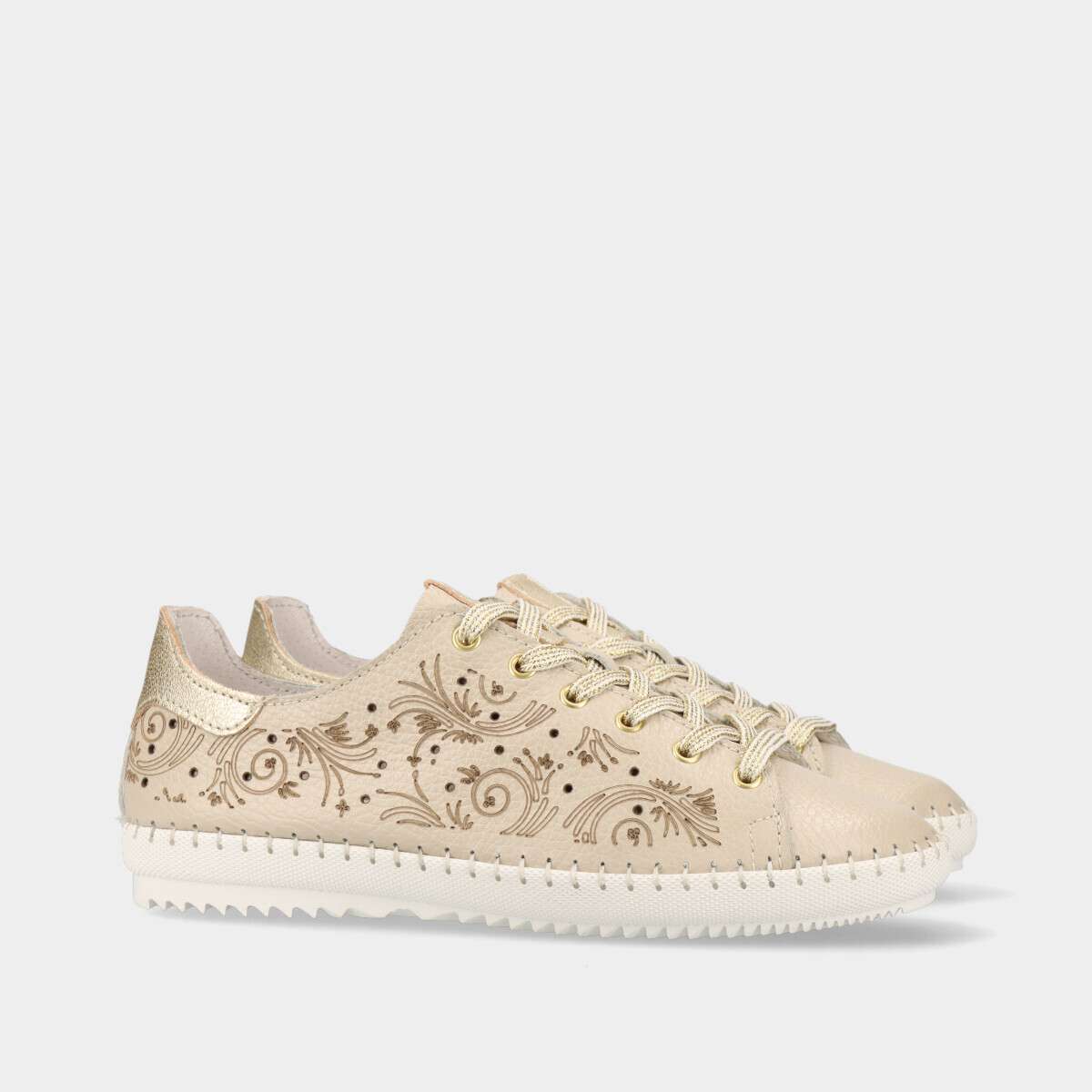 Sapato feminino confortável em pele macia, cor bege com detalhes dourados, palmilha de espuma e sola flexível, com cordão. Fabricado em Portugal.