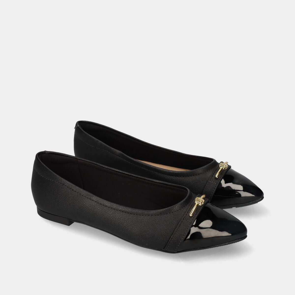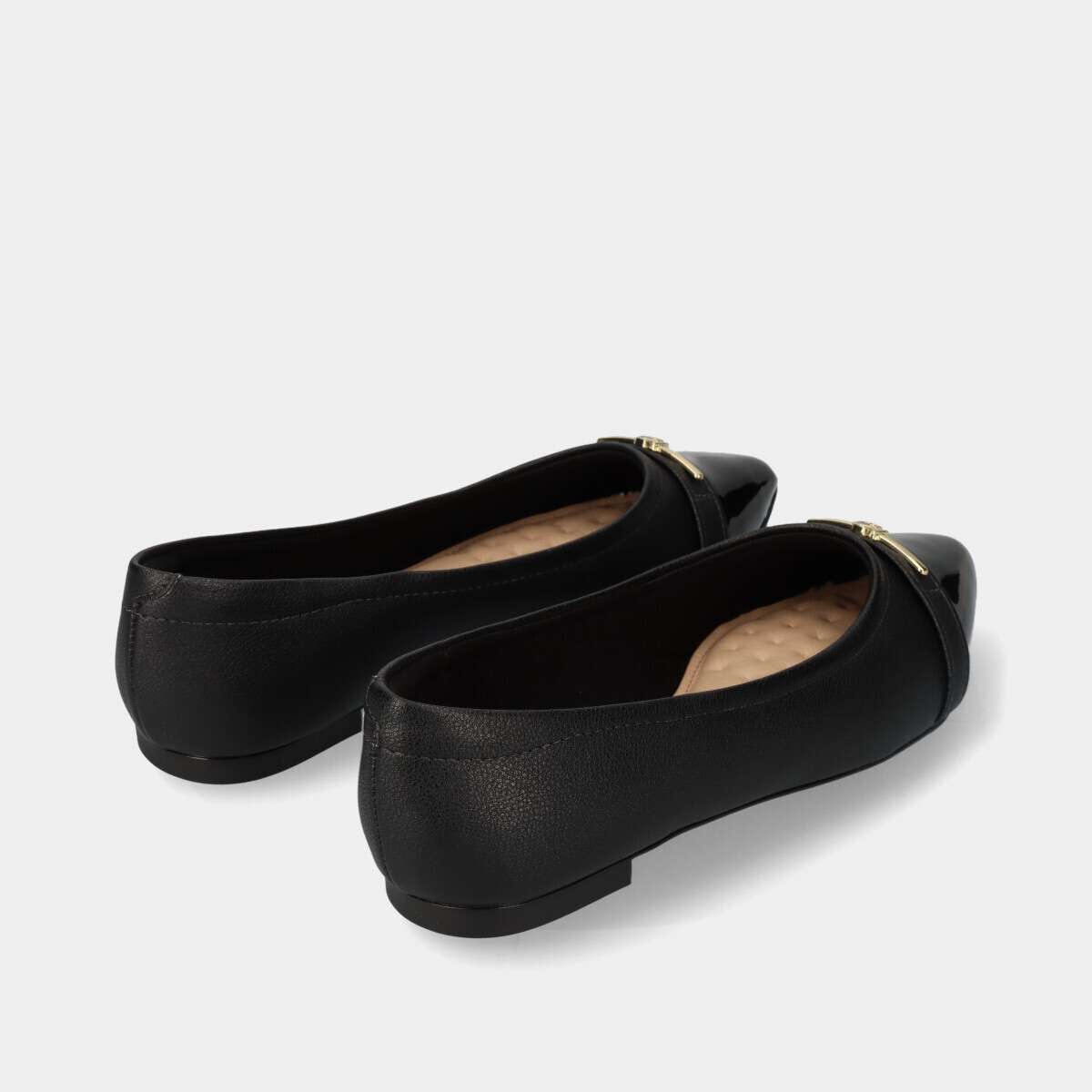 Sapato estilo flat na cor preta com bico fino, aplicação dourada e palmilha de espuma extremamente confortável.