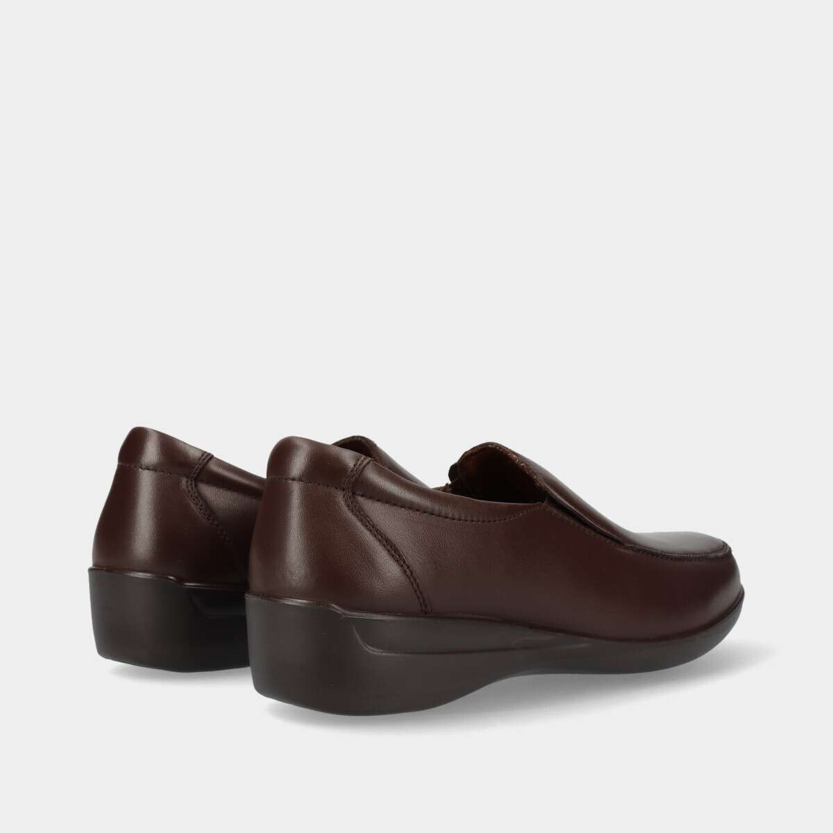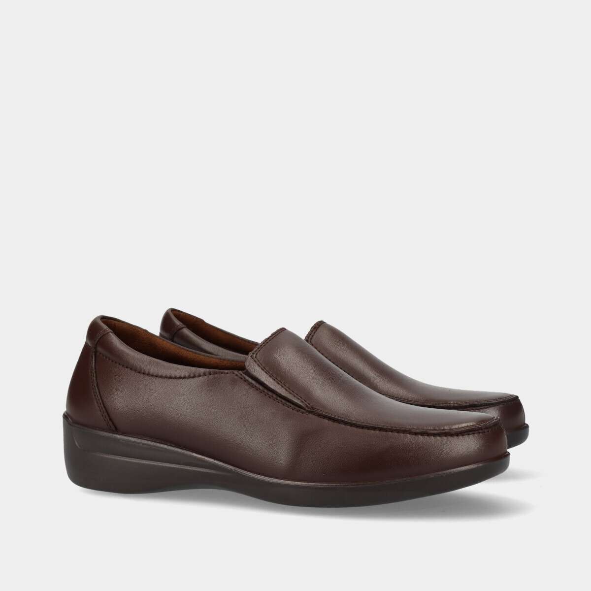 Sapato em pele na cor castanha de conforto com elástico nas laterais.