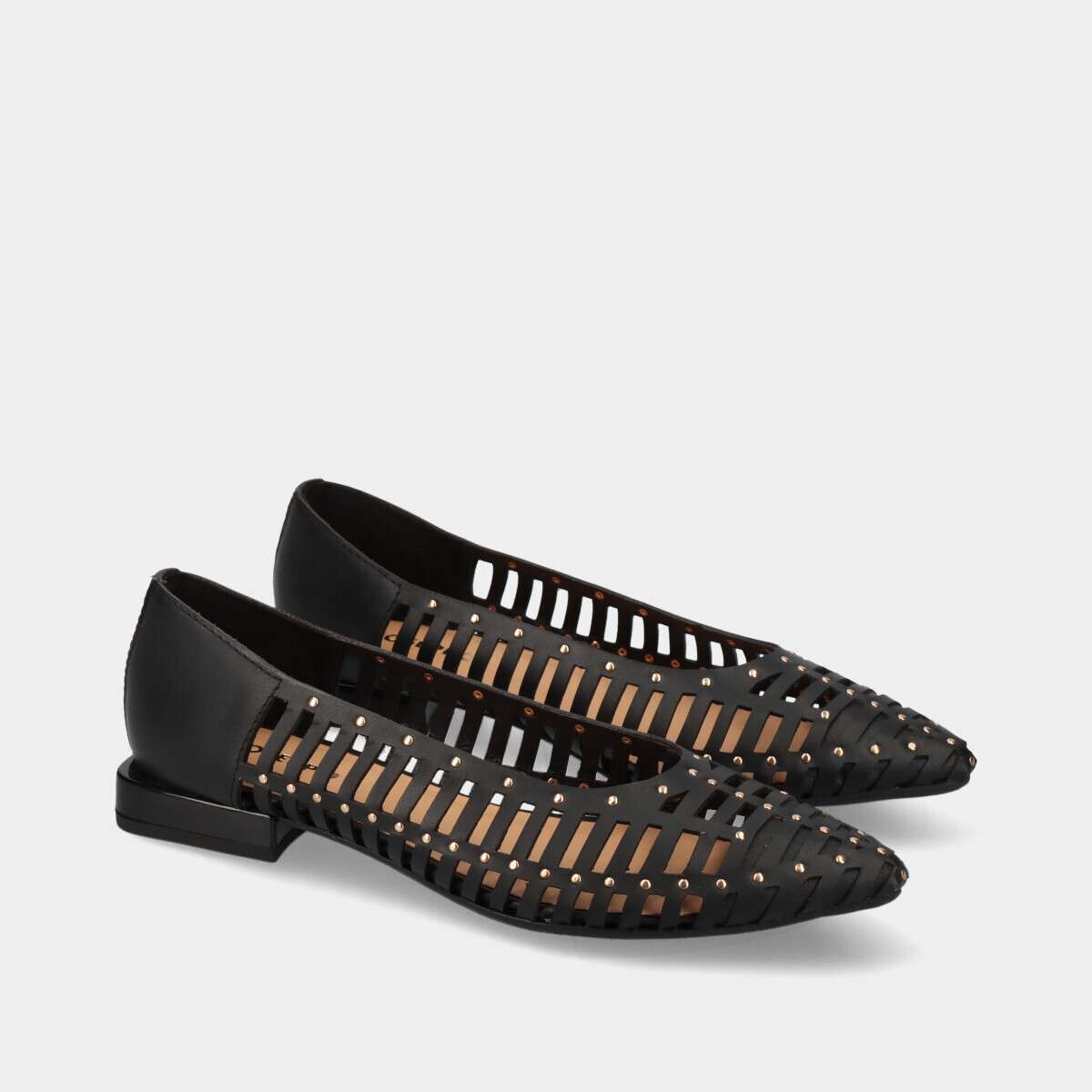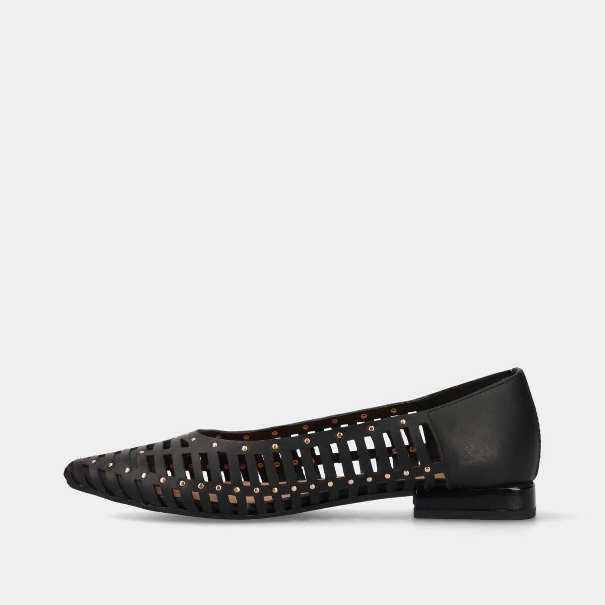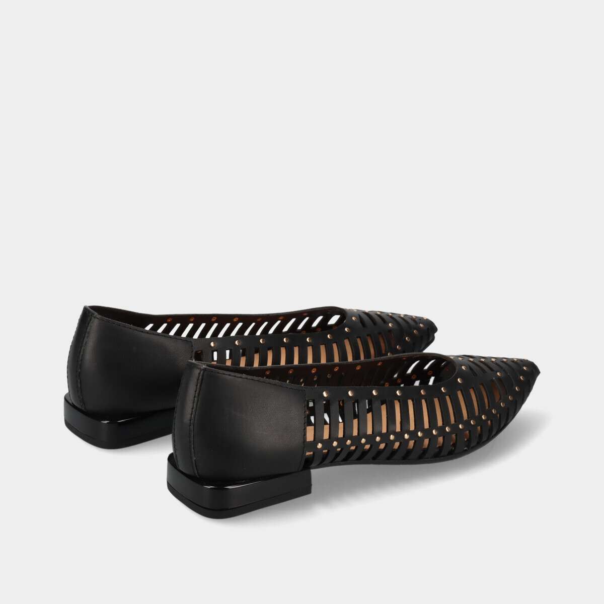 Sapatos Gioseppo Kenosha em preto, com tachas douradas. Modelo de bico fino, em couro perfurado, com forro em couro e palmilha acolchoada.