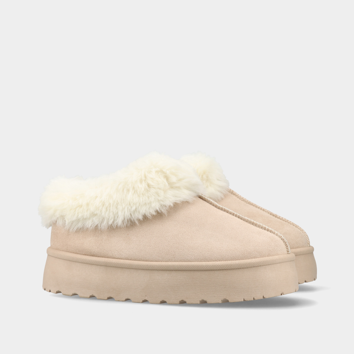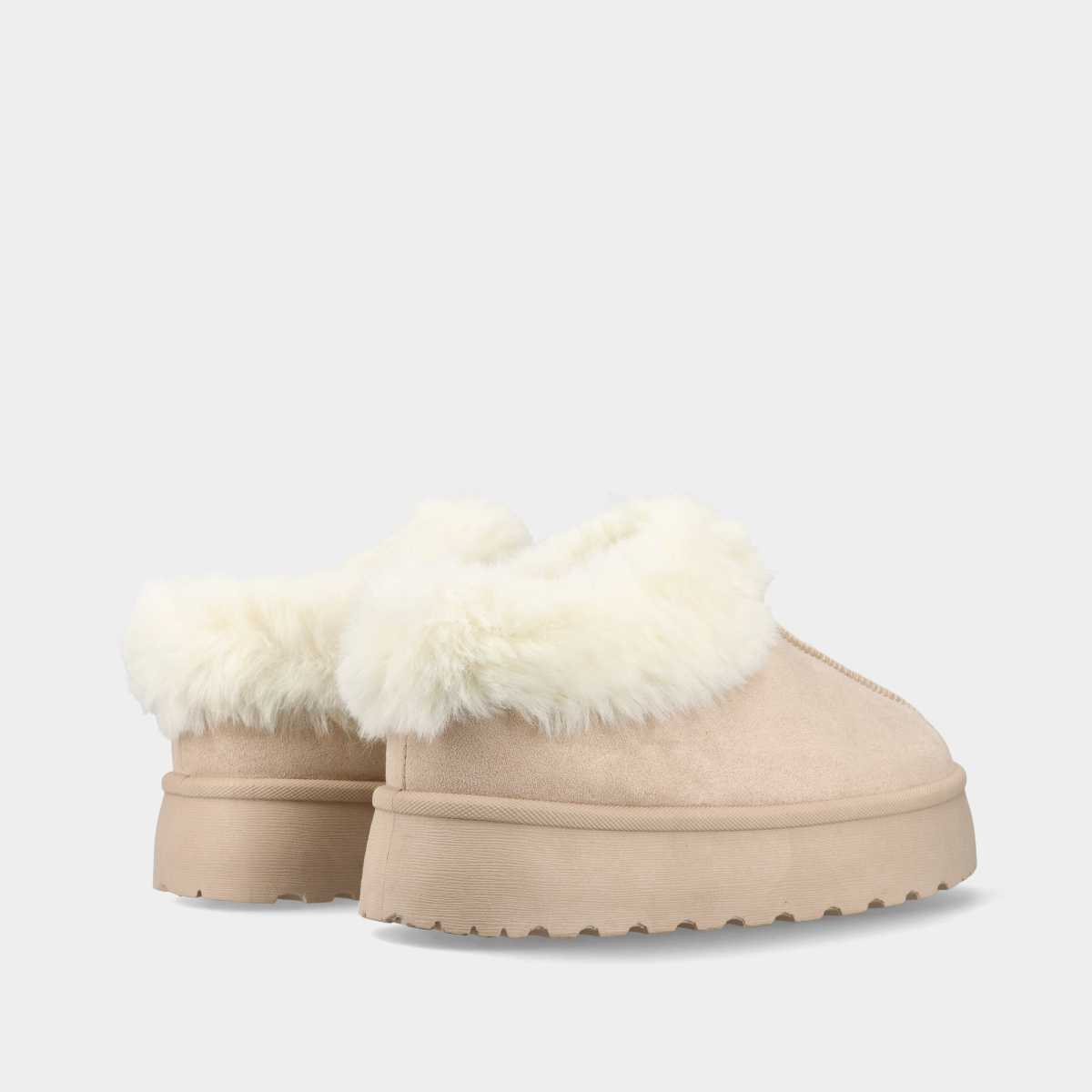 Sapatos de plataforma para mulher em bege, com forro e gola em pelo quente, ideais para conforto e estilo no outono e inverno.