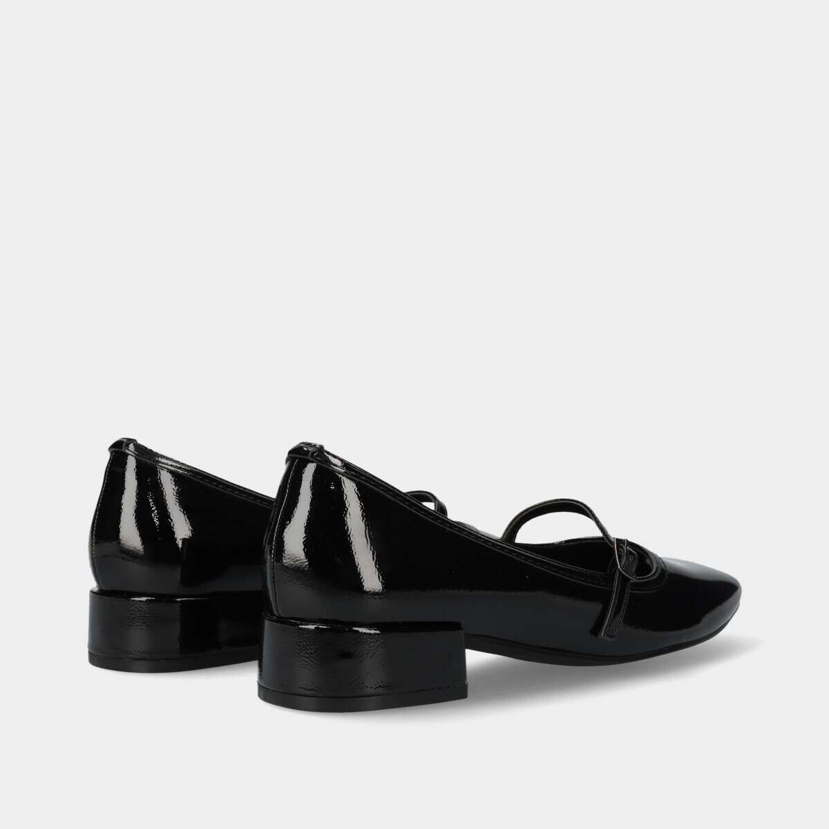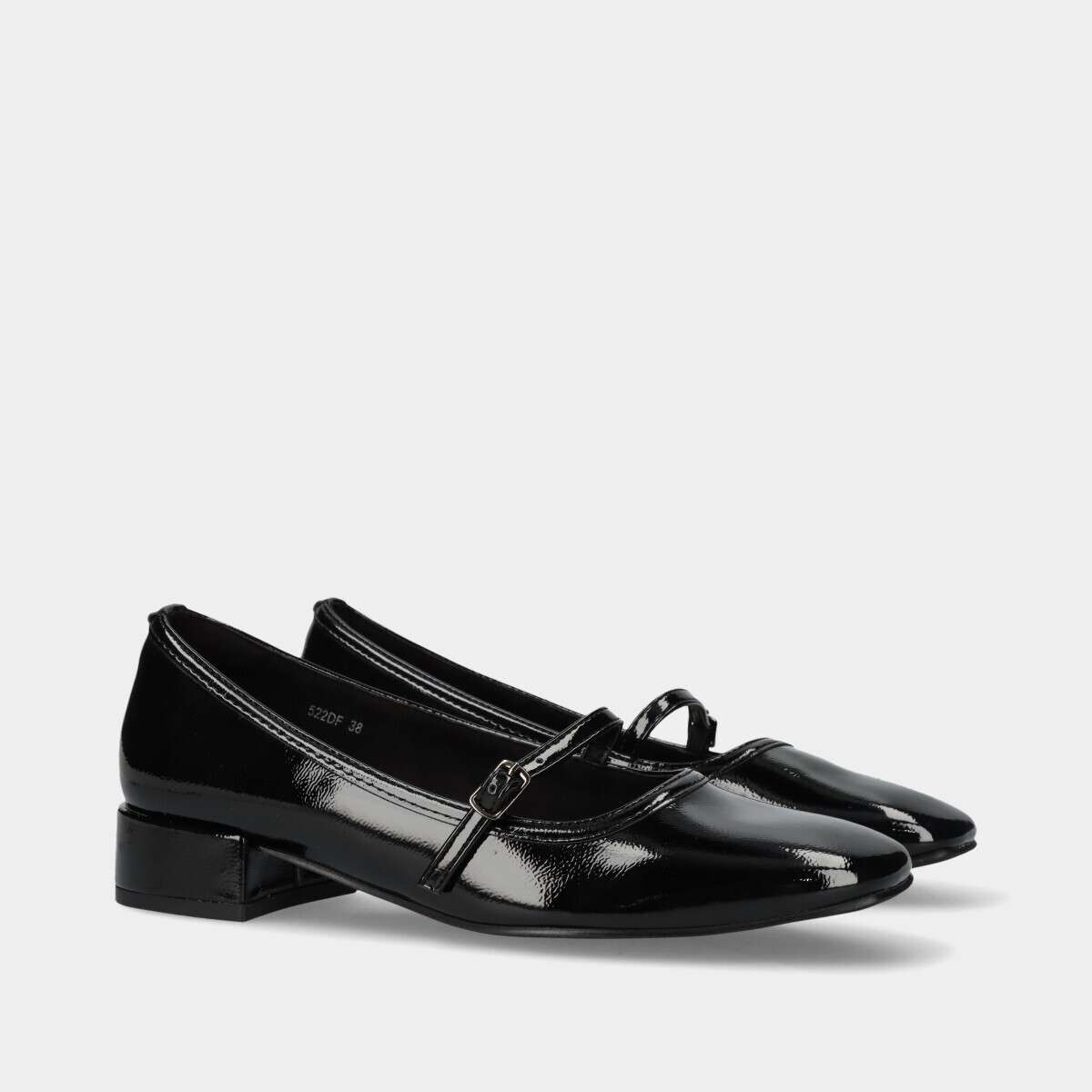 Sabrina na cor preta com uma fivela no peito do pé e palmilha de espuma.