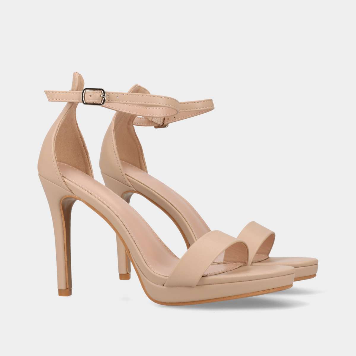 Sandália de festa em bege com salto fino, compensado à frente e fivela lateral para um ajuste perfeito.