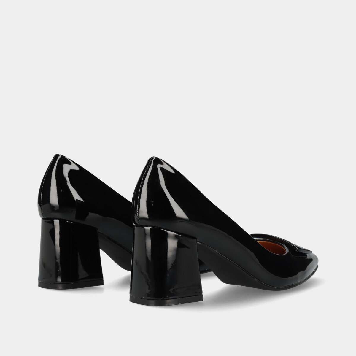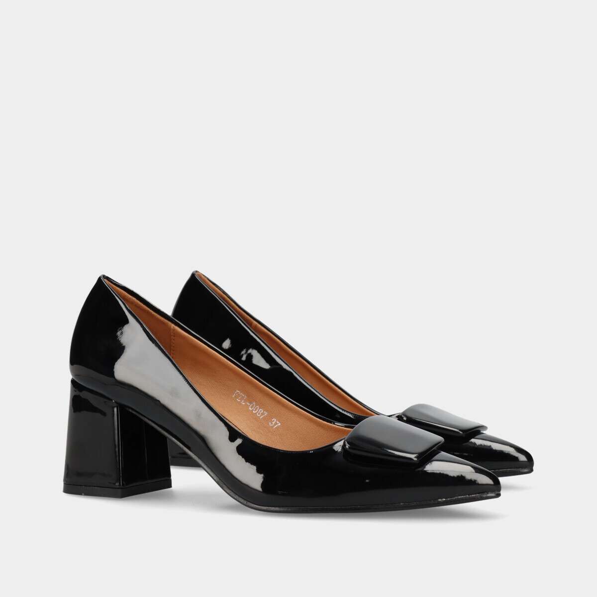 Sapato de salto médio em preto para mulher. Modelo clássico com biqueira fina, salto largo e aplicação decorativa. Ideal para trabalho, cerimónias ou uso diário. Confortável, elegante e versátil.